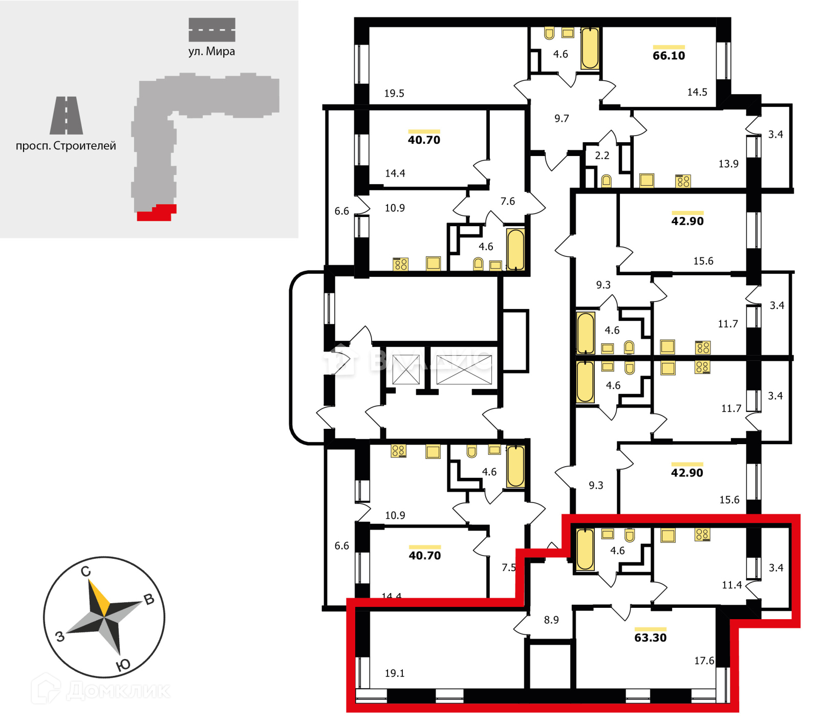 2-комнатная квартира, 61.1 м2, этаж 16 / 19, на продажу во Владимире, проспект Строителей, 9к1