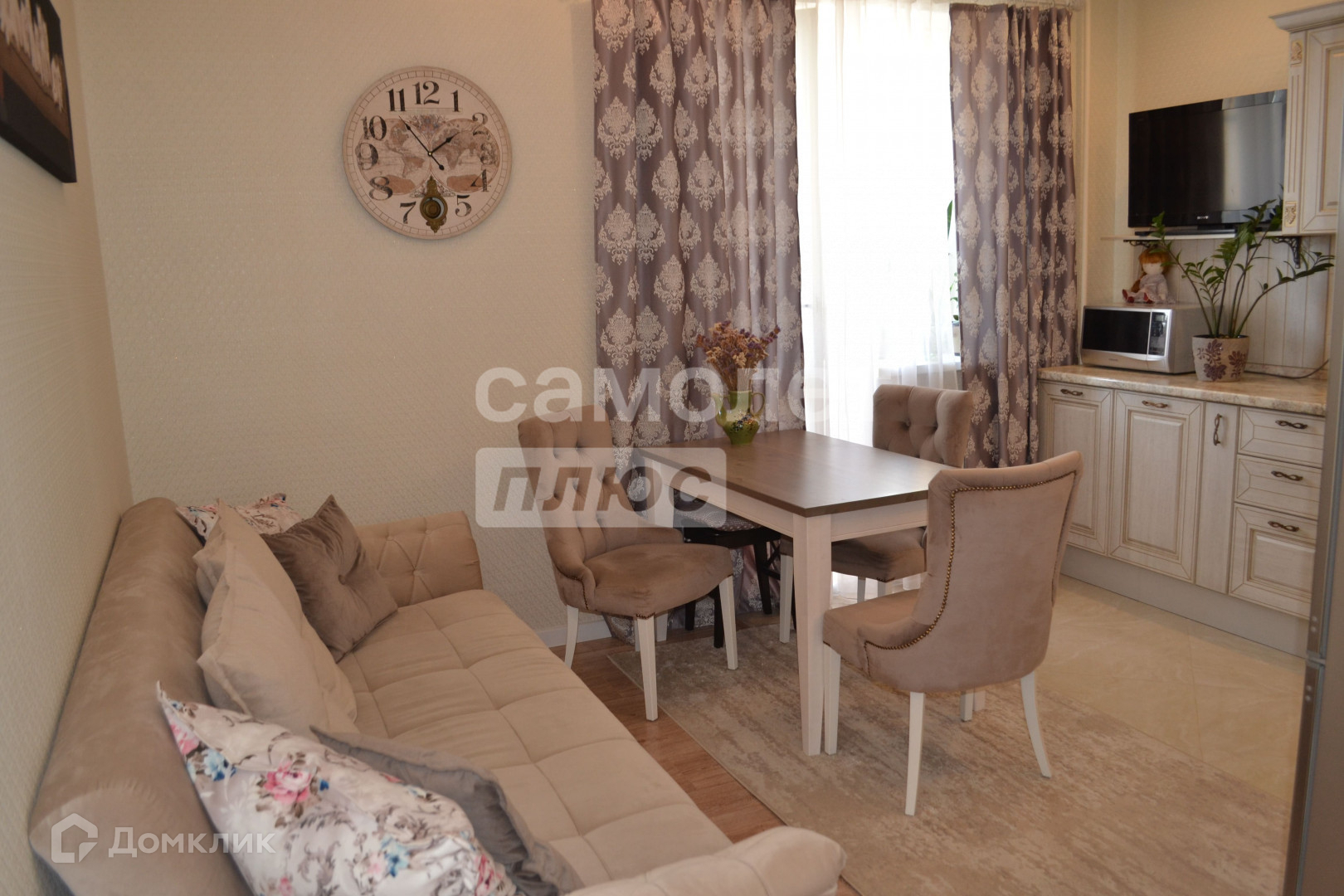 В большой (14,3 кв м) кухне-гостиной новым владельцам остается дорогой кухонный гарнитур в светлых тонах, выполненный в классическом стиле.