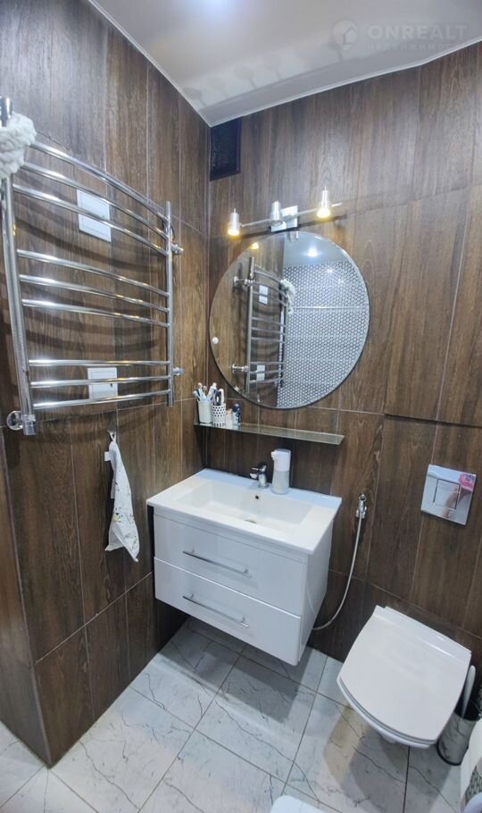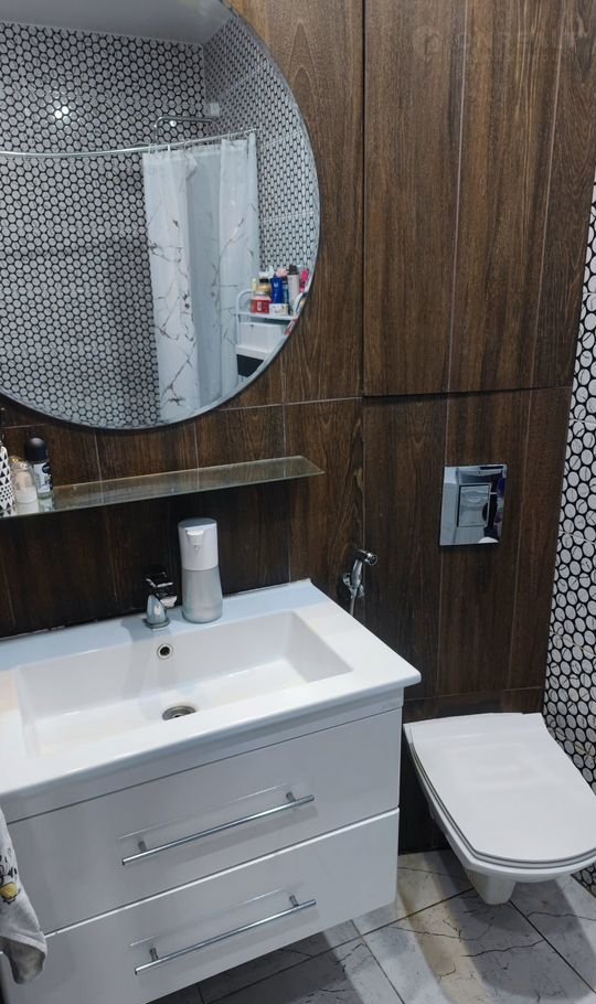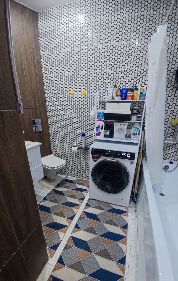 В ванной свежая плитка и современная сантехника — не требует вложений, всё готово к комфортному проживанию.