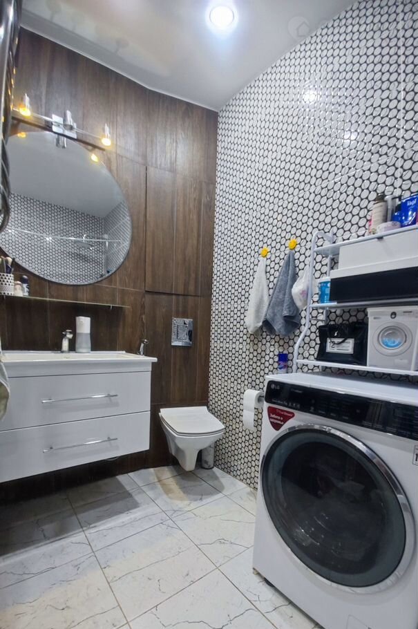 Санузел совмещённый, установлена инсталляция, подвесная тумба, есть место для стиральной машины.