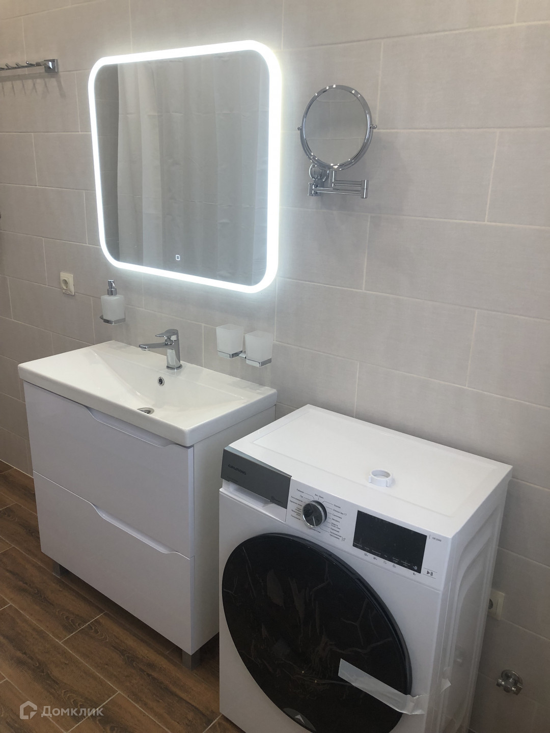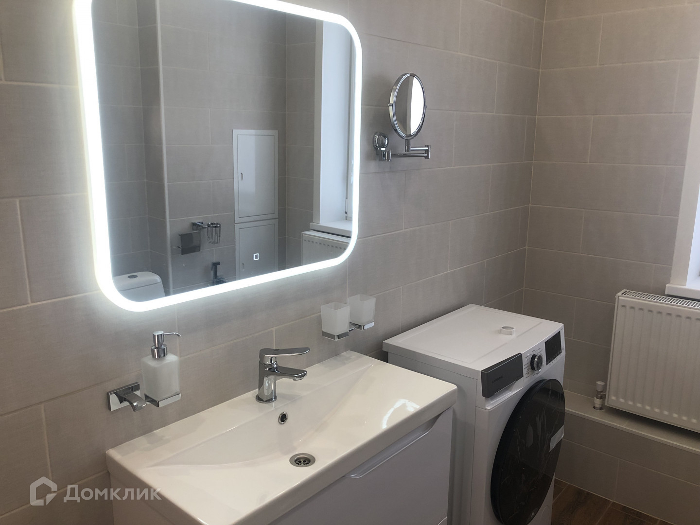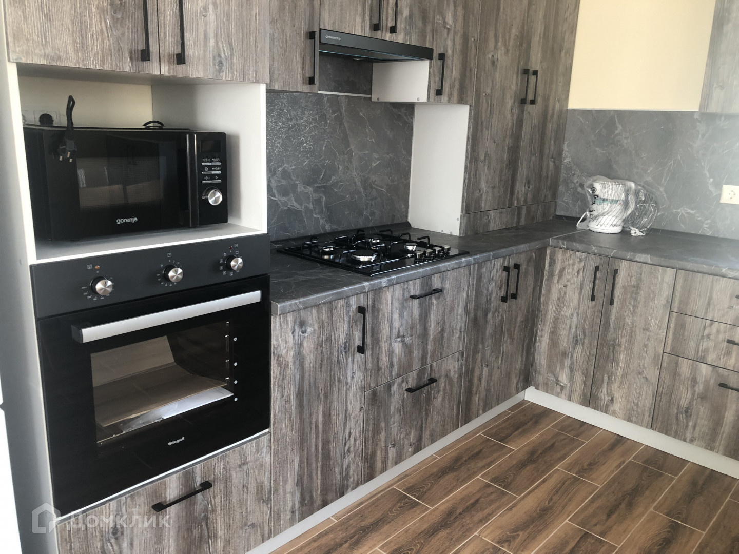 Дом с современной мебелью и техникой (духовой шкаф, варочная поверхность, микроволновая печь, холодильник, ТВ, чайник, стиральная машина).