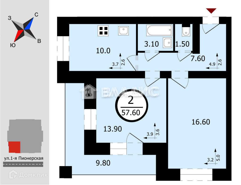 Общая площадь 57.6 м2