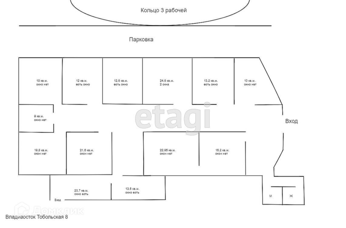 Помещение состоит из холла, коридора, и 13 помещений площадью от 9 до 24 кв.м. разделенных между собой качественными стеклянными перегородками. Санузел с хорошим ремонтом, раздельный (мужской\женский). Окна есть только с фронтальной стороны здания.