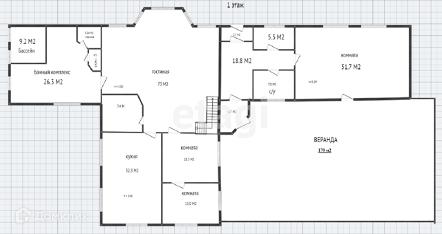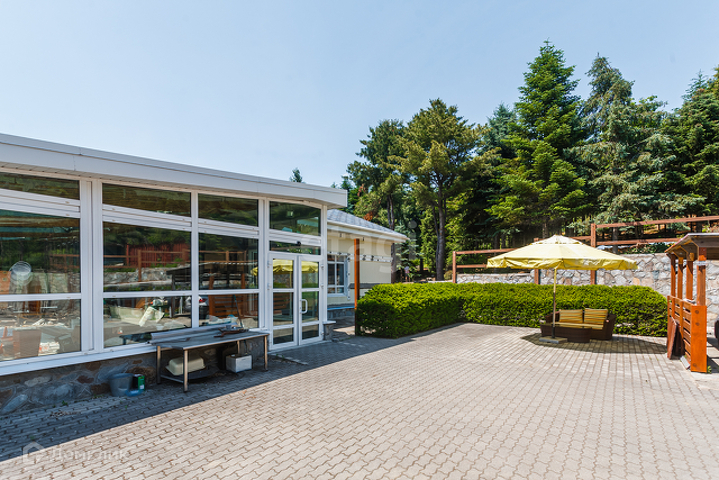Большая площадь закрытой веранды 200 м2 с бассейном 24 м2, просторная гостиная 73 м2 с огромным камином позволит принимать гостей с комфортом.