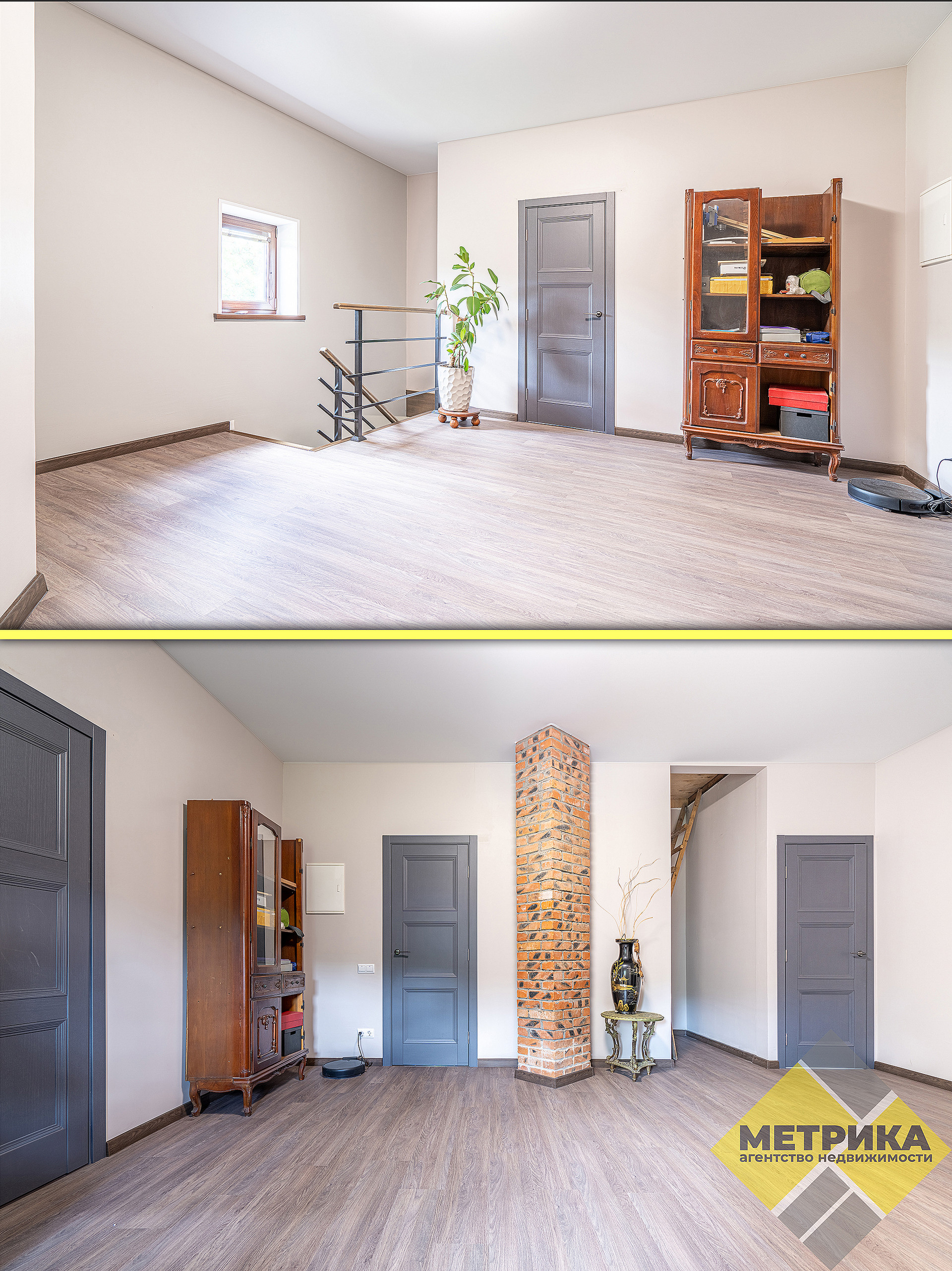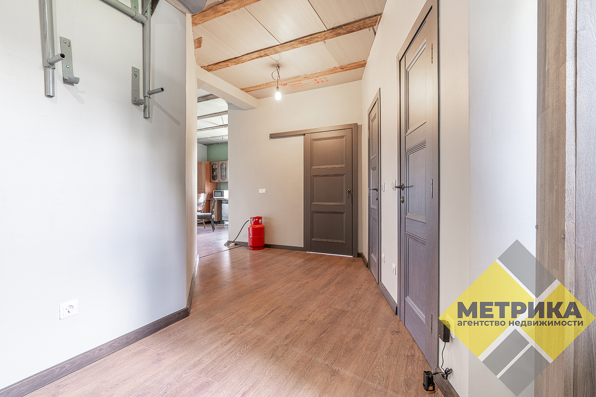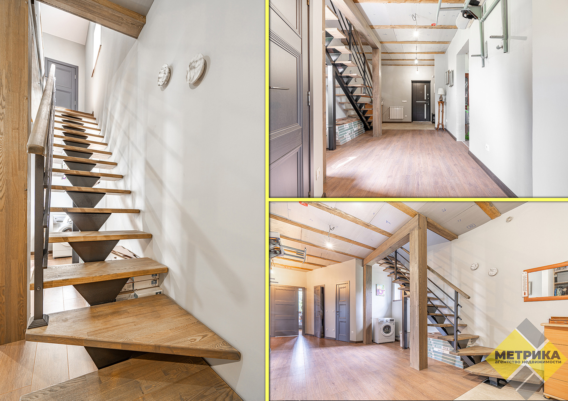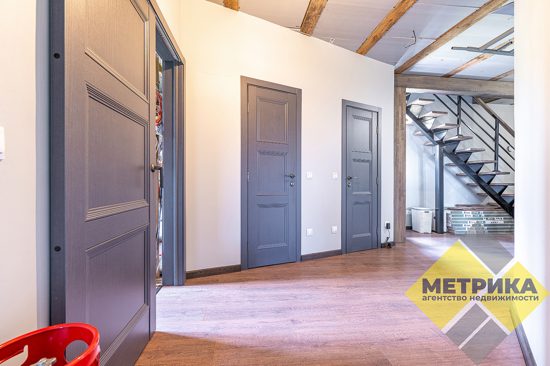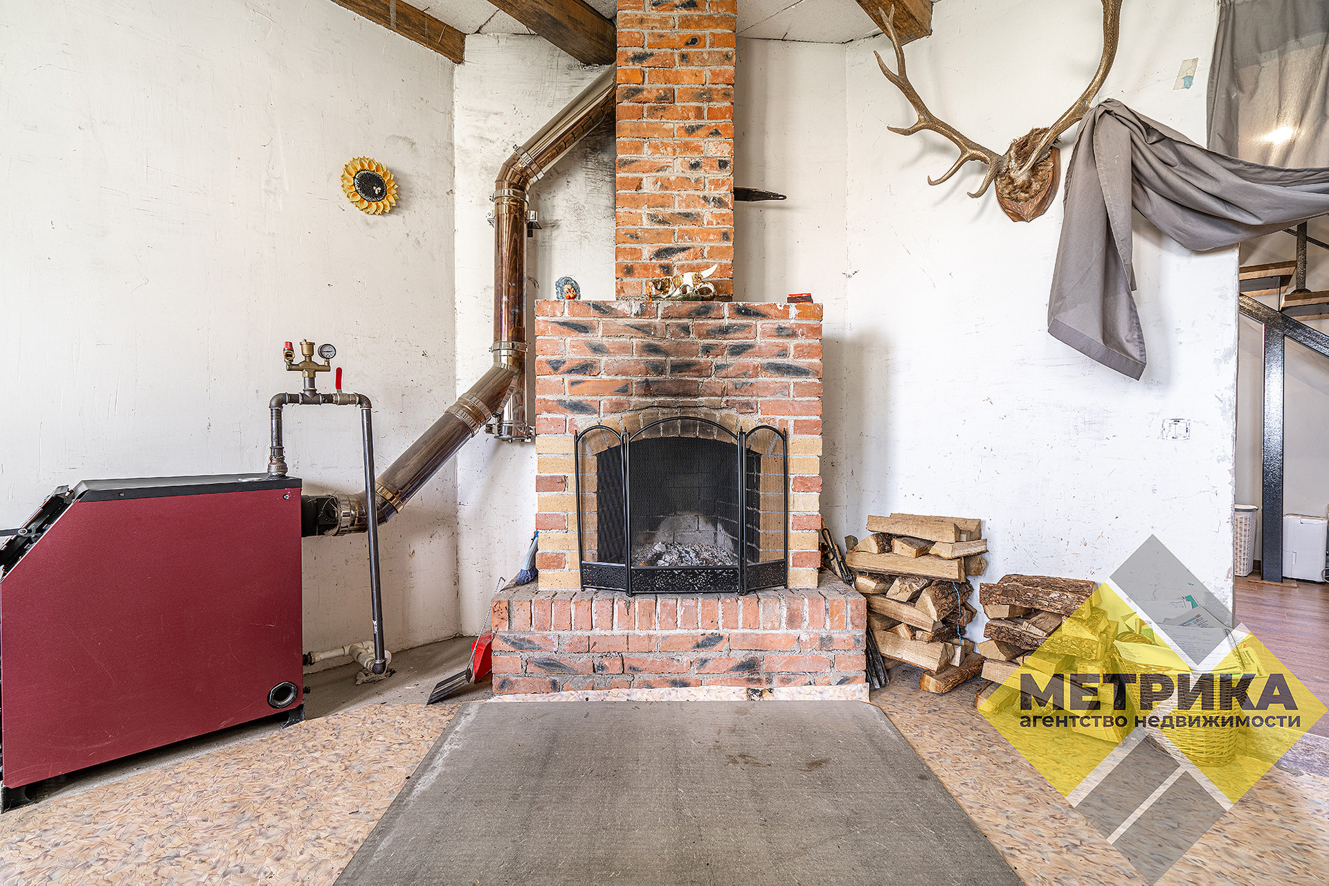 Лестница сварная, ступеньки - дерево ясень. В каждой комнате установлена межкомнатная дверь. Действующий камин.