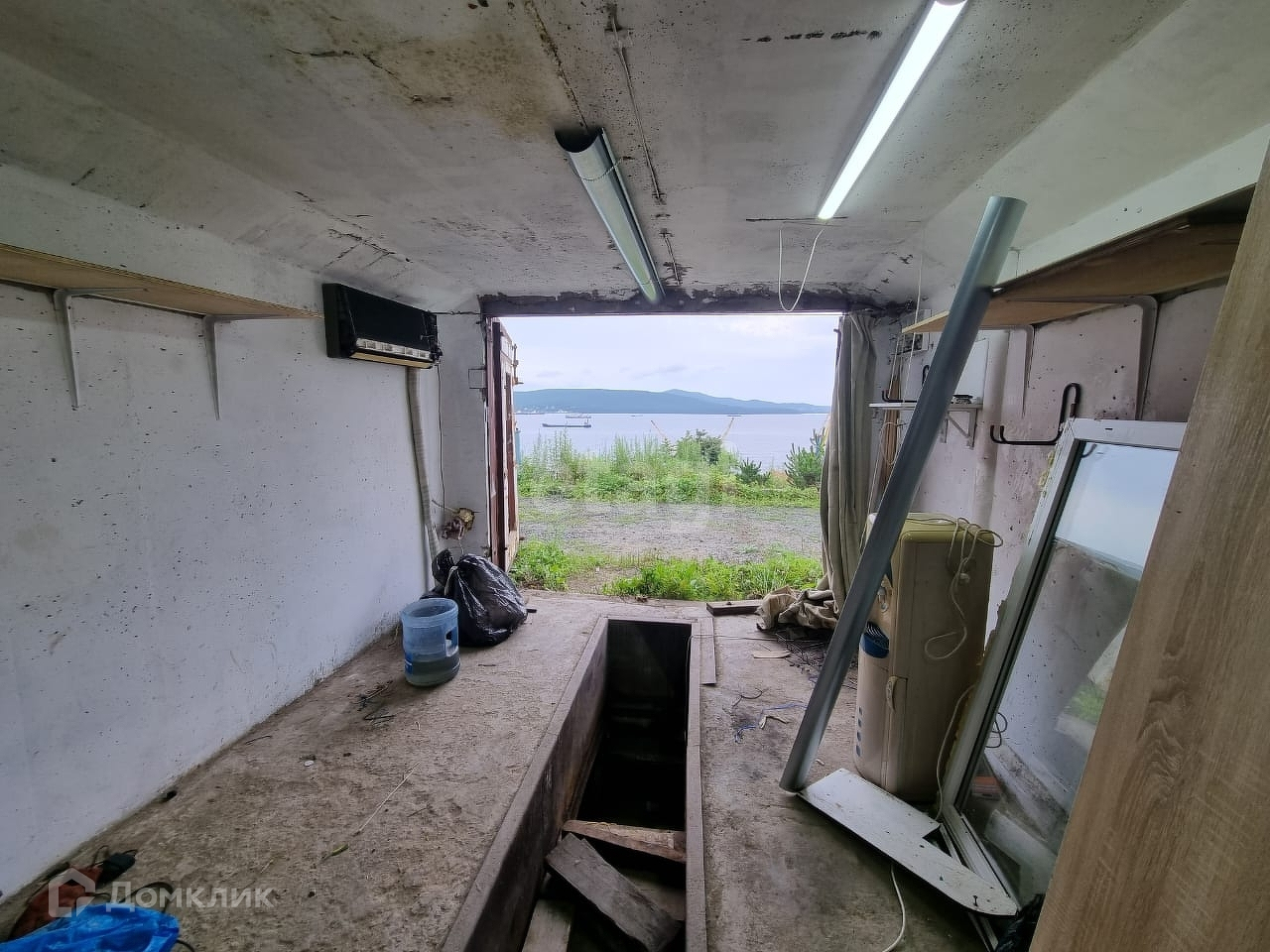 Внутри есть кондиционер, стеллажи, подвал.