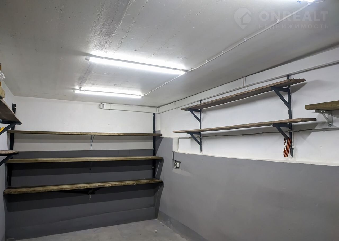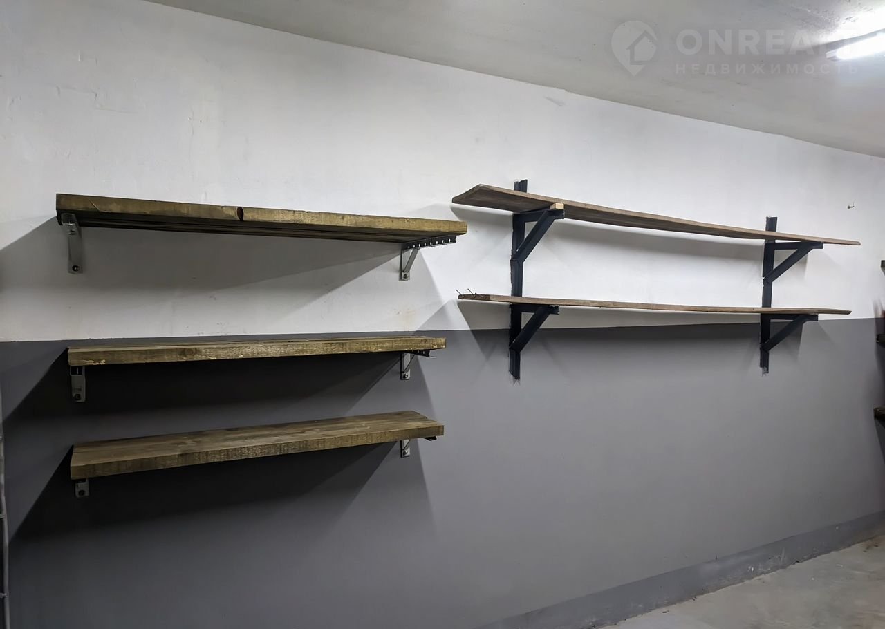 Гараж оборудован большим количеством полок для хранения вещей.