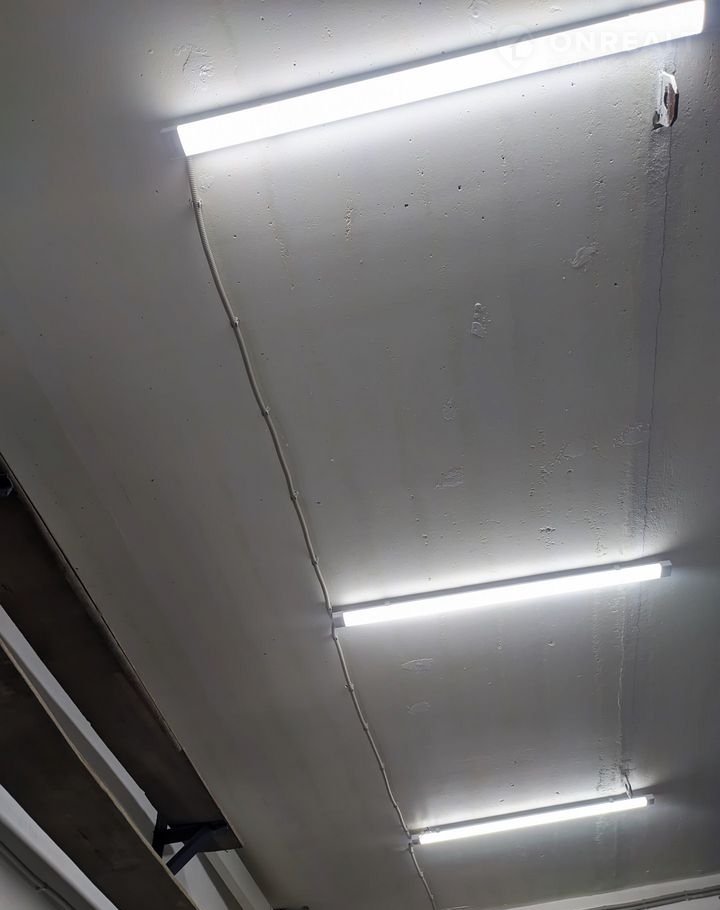Стены, пол и потолок покрашены. У входа в гараж смонтирован светодиодный прожектор с датчиком движения.