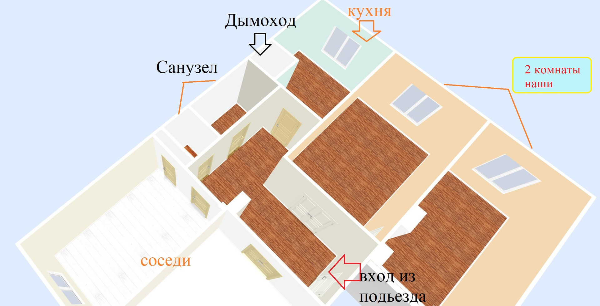 • Квартира на 3-х хозяев. Наша доля Выделена (на основании свидетельства о праве собственности на 2 комнаты) в праве общей собственности - 54%.