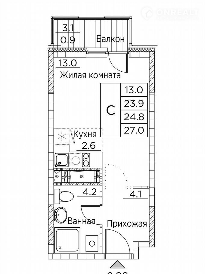 Общая площадь 27 м2