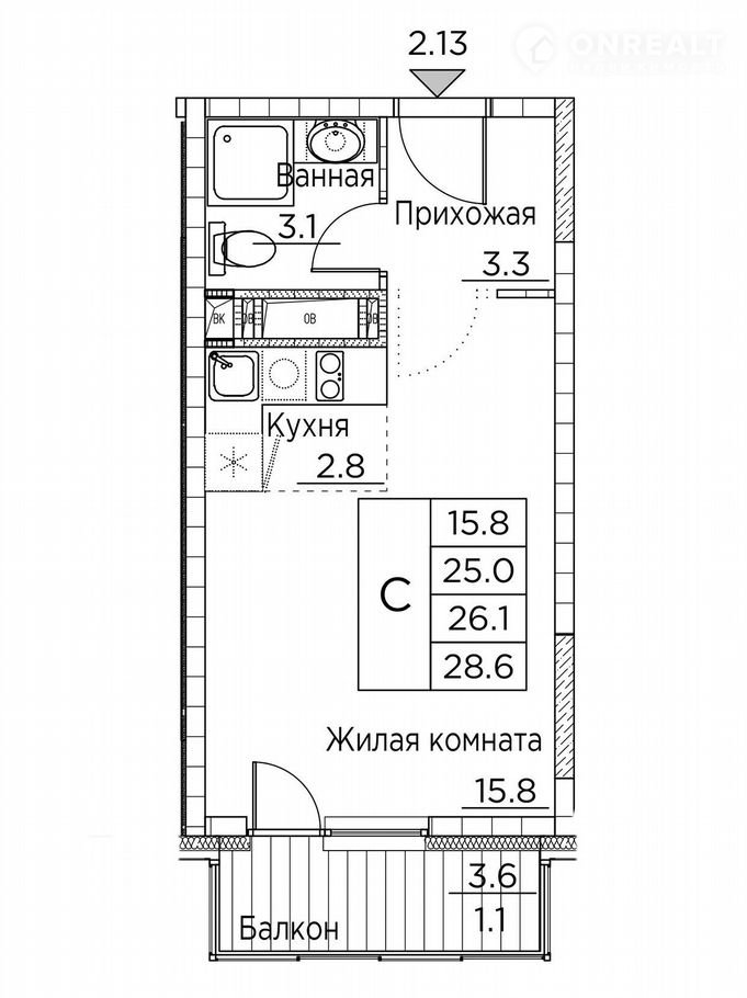 Общая площадь 28.6 м2