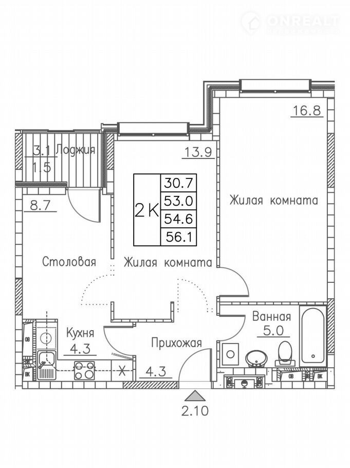 Общая площадь 56.1 м2