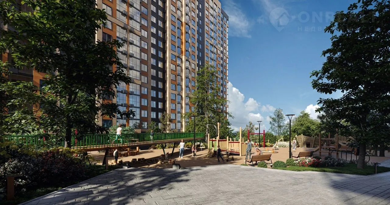 Территория ЖК закрытая и охраняемая: двор без машин с ландшафтным парком и игровыми комплексами, переменная этажность зданий, которая создает визуальный простор.