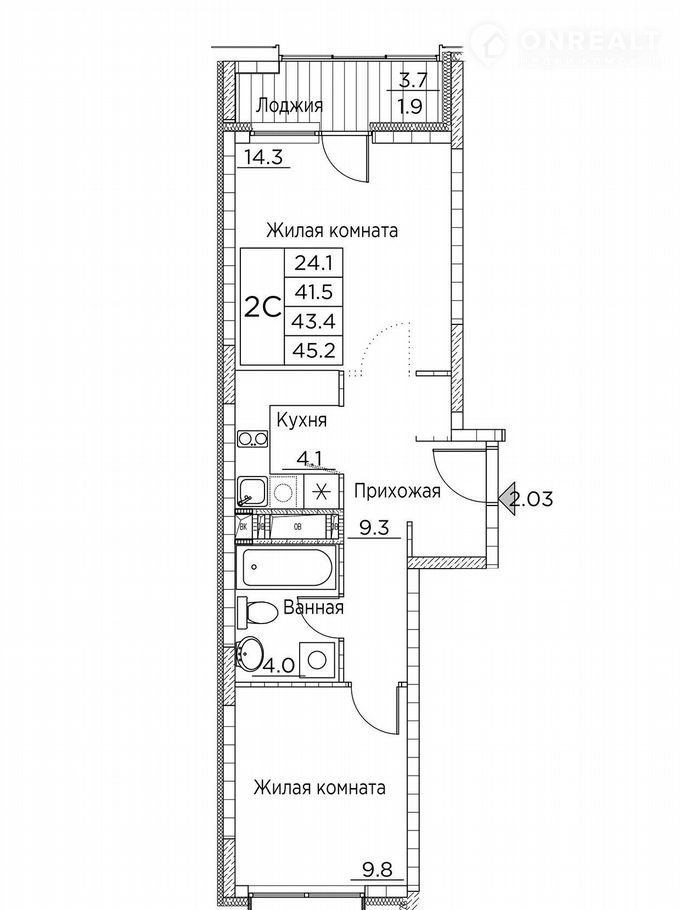 Общая площадь 45.2 м2
