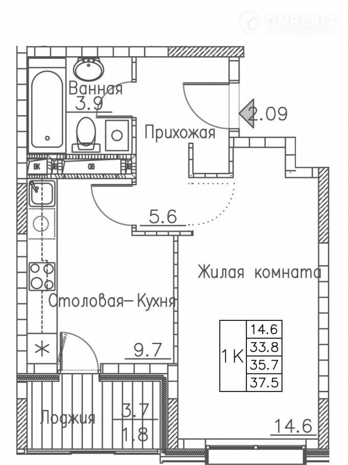 Общая площадь 37.5 м2
