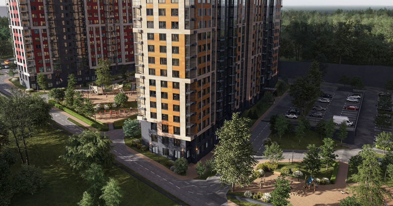 Территория ЖК закрытая и охраняемая: двор без машин с ландшафтным парком и игровыми комплексами, переменная этажность зданий, которая создает визуальный простор.