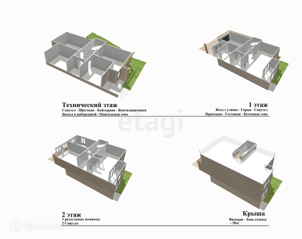Дом обладает массой преимуществ, начиная с самого первого, технического этажа. Попадая в дом с нижнего яруса мы оказываемся в техническом помещении, которое спроектировано под котельную, вентиляционную и щитовую – сердце дома. Так же на этом уровне выделены две отдельные комнаты, которые Вы сможете спроектировать на своё усмотрение (например это может быть бойлерная/прачечная/складское либо бытовое помещение, что позволит освободить квартиру от ненужных вещей, любые ваши фантазии). Так же в этой зоне присутствует комната сан/узла.