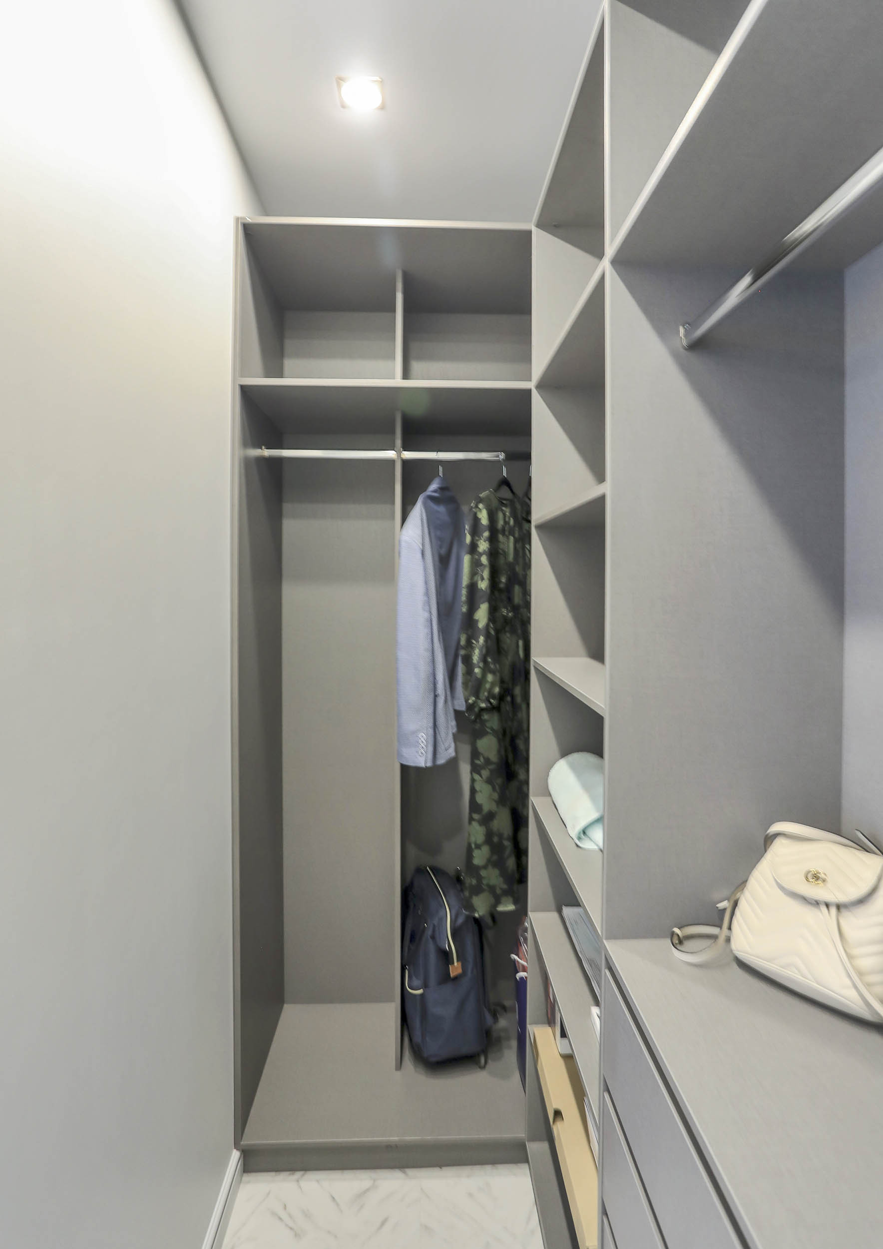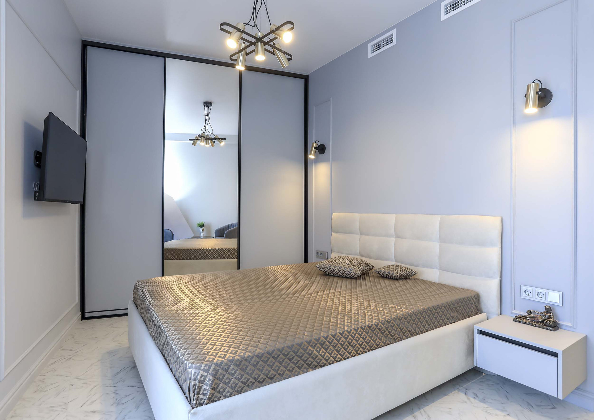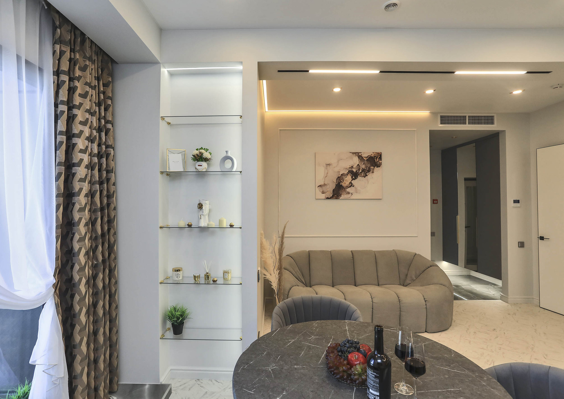 Большое количество встроенной мебели, скрытые элементы в дизайне, легкие теплые тона в интерьере, продумано всё до мелочей.