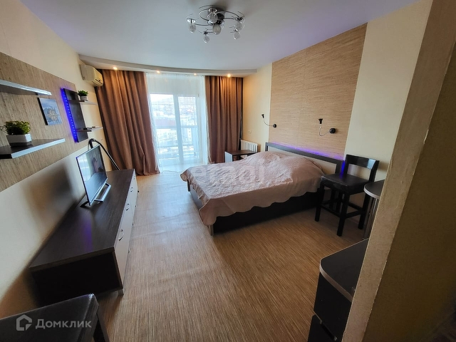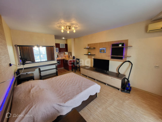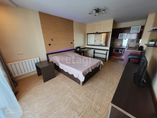 В комнате кровать, столик с большим зеркалом и подсветкой. Освещение удобно разделено на разные зоны, в том числе имеются декоративные подсветки за спинкой кровати, на кухонном гарнитуре и другие.