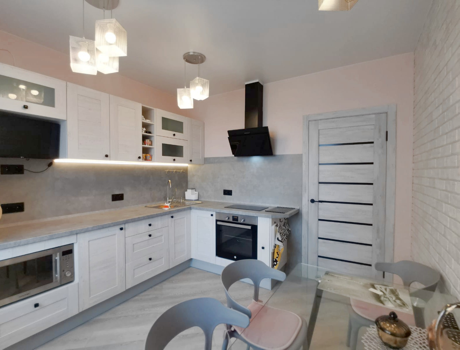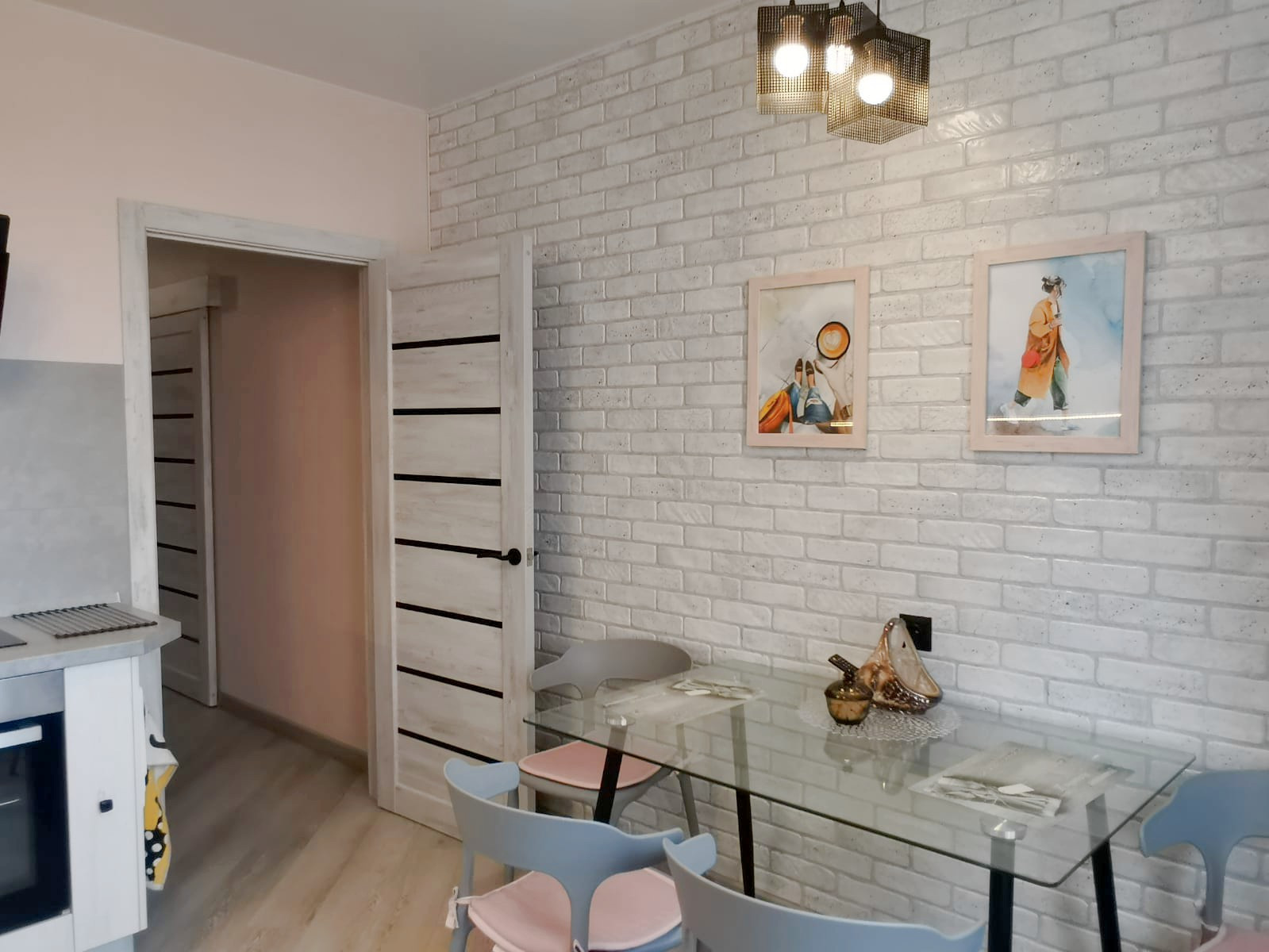* В кухне фартук из кварцвиниловой плитки, в обеденной зоне декоративные панели.