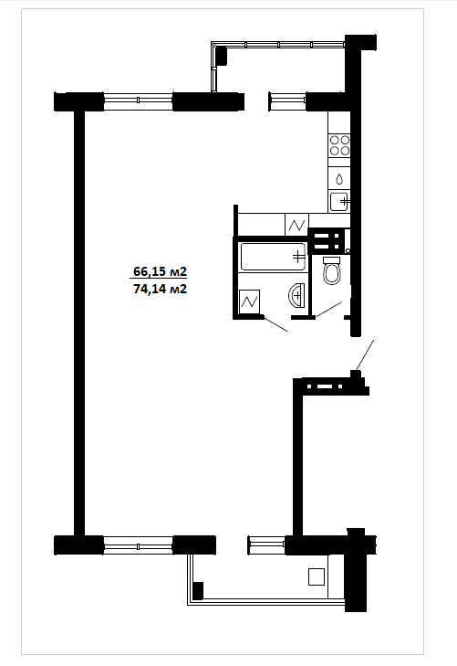 • площадь квартиры с двумя лоджиями - 74,14 м2.