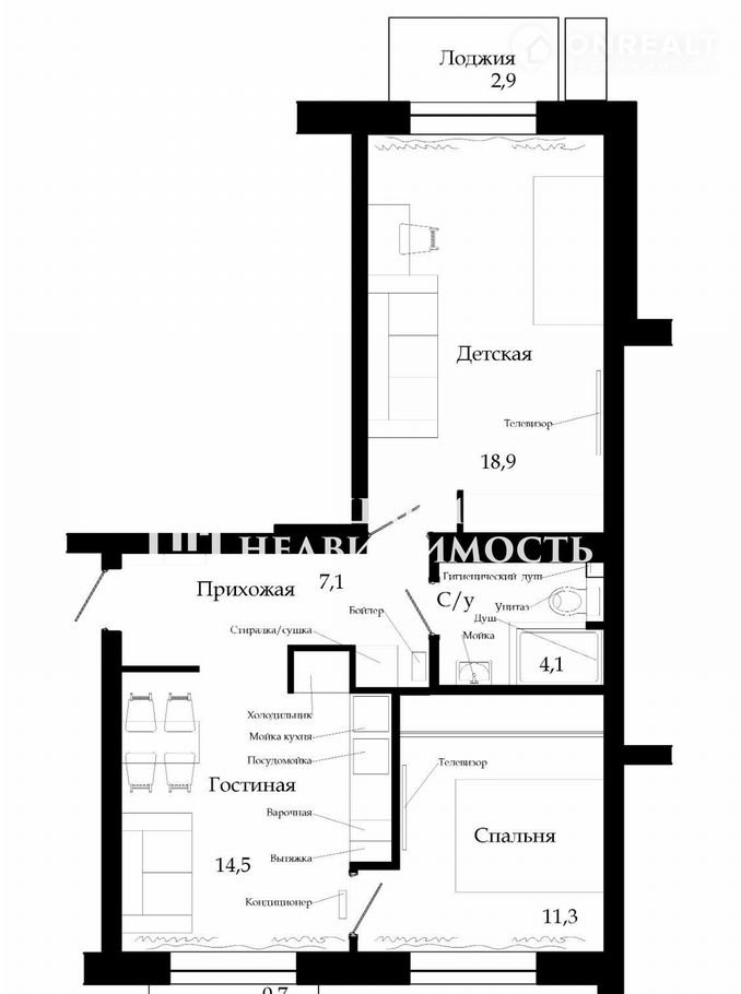 — Спальня 11.3 кв.м (северо-восток) и Детская/вторая спальня 18.9 кв.м с застекленной лоджией 2.9 кв.м (юго-запад)