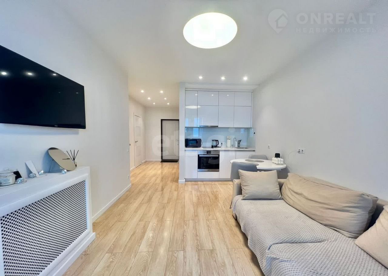 Квартира представлена в формате 2-е — совмещённая кухня-гостиная и отдельная спальня. Дополнительно обустроена удобная гардеробная комната. Особенностью объекта являются два балкона, открывающие живописный вид на городские пейзажи.
