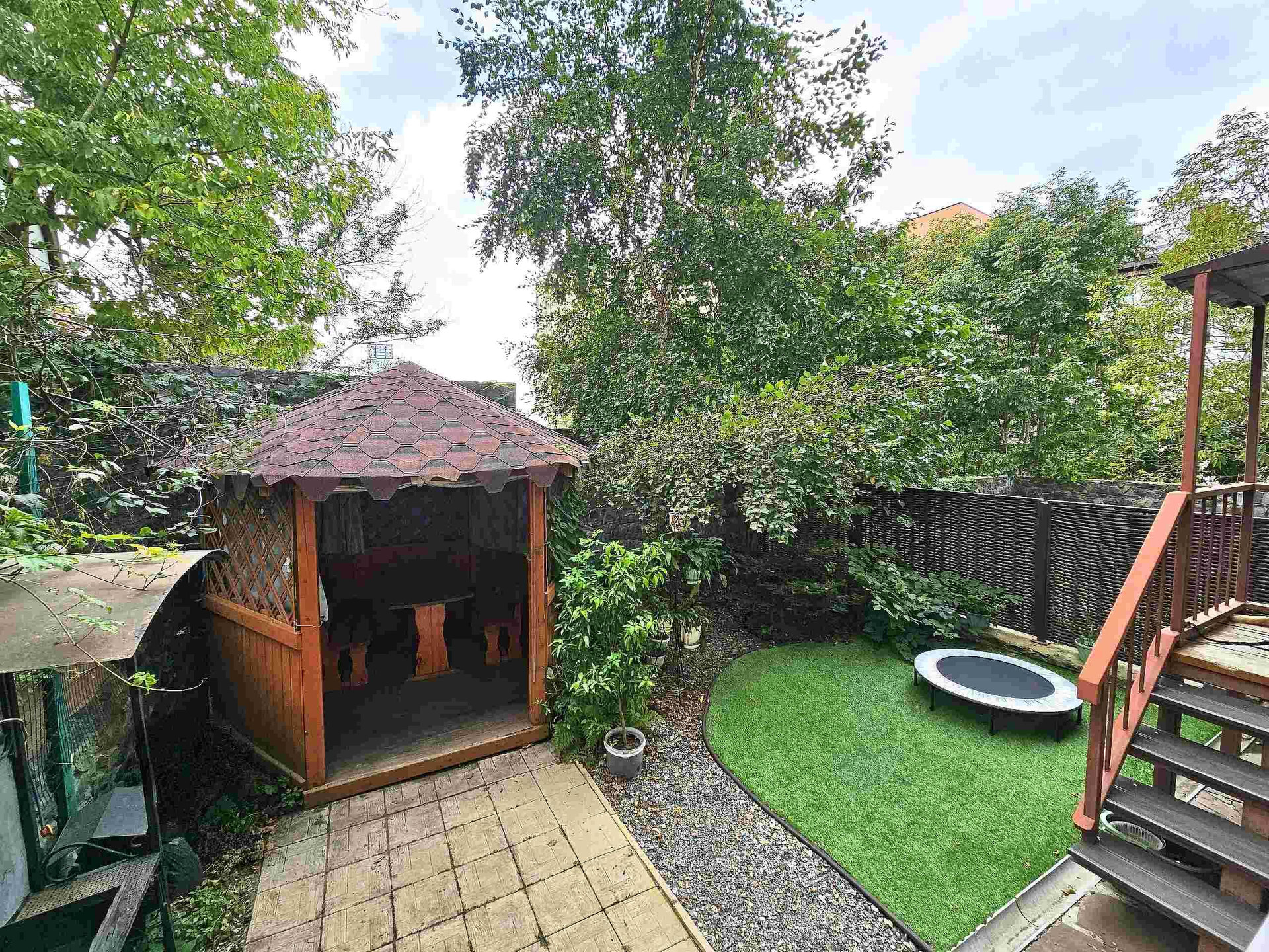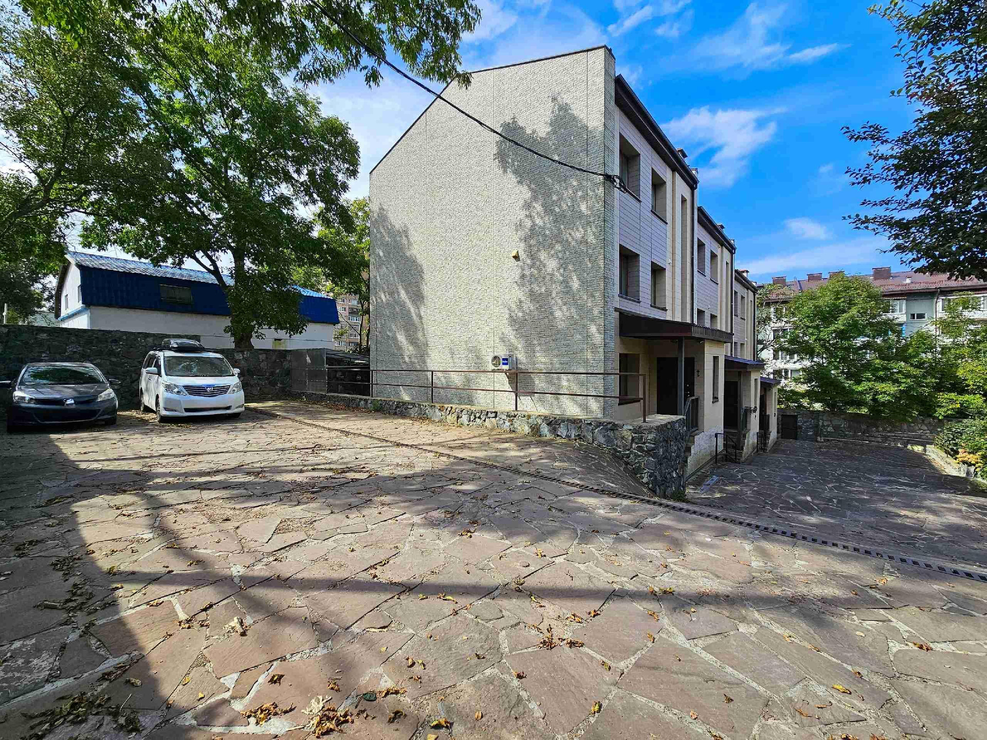 В собственности участок под домом с местом личной зоны барбекю. Вокруг участка насажены деревья, которые придают ощущение загородной жизни. От городской суеты вас также будет отделять красивый забор из камня. А свои личные места для парковки позволят не переживать за свои автомобили и избавят от поиска мест после рабочего дня.