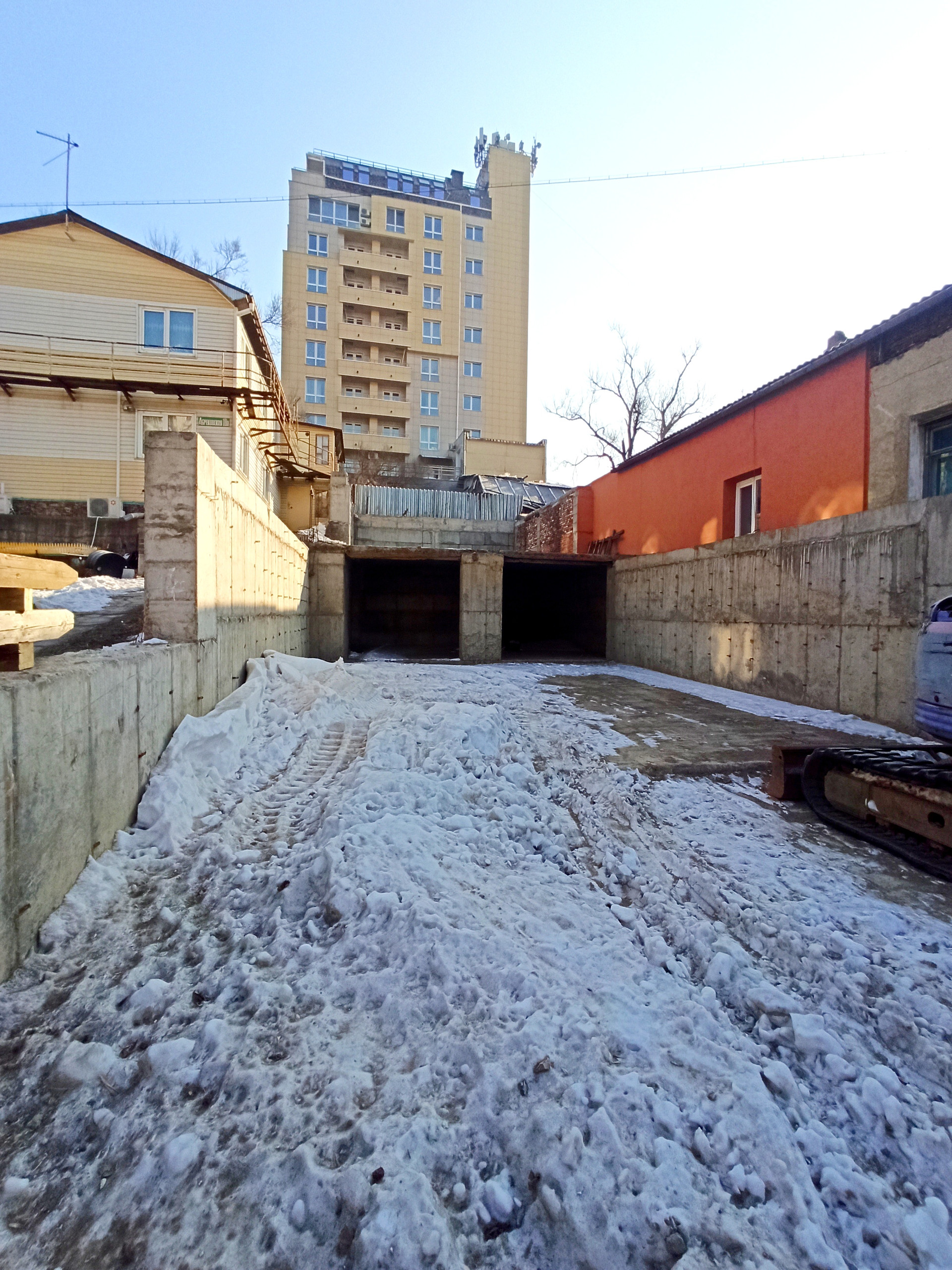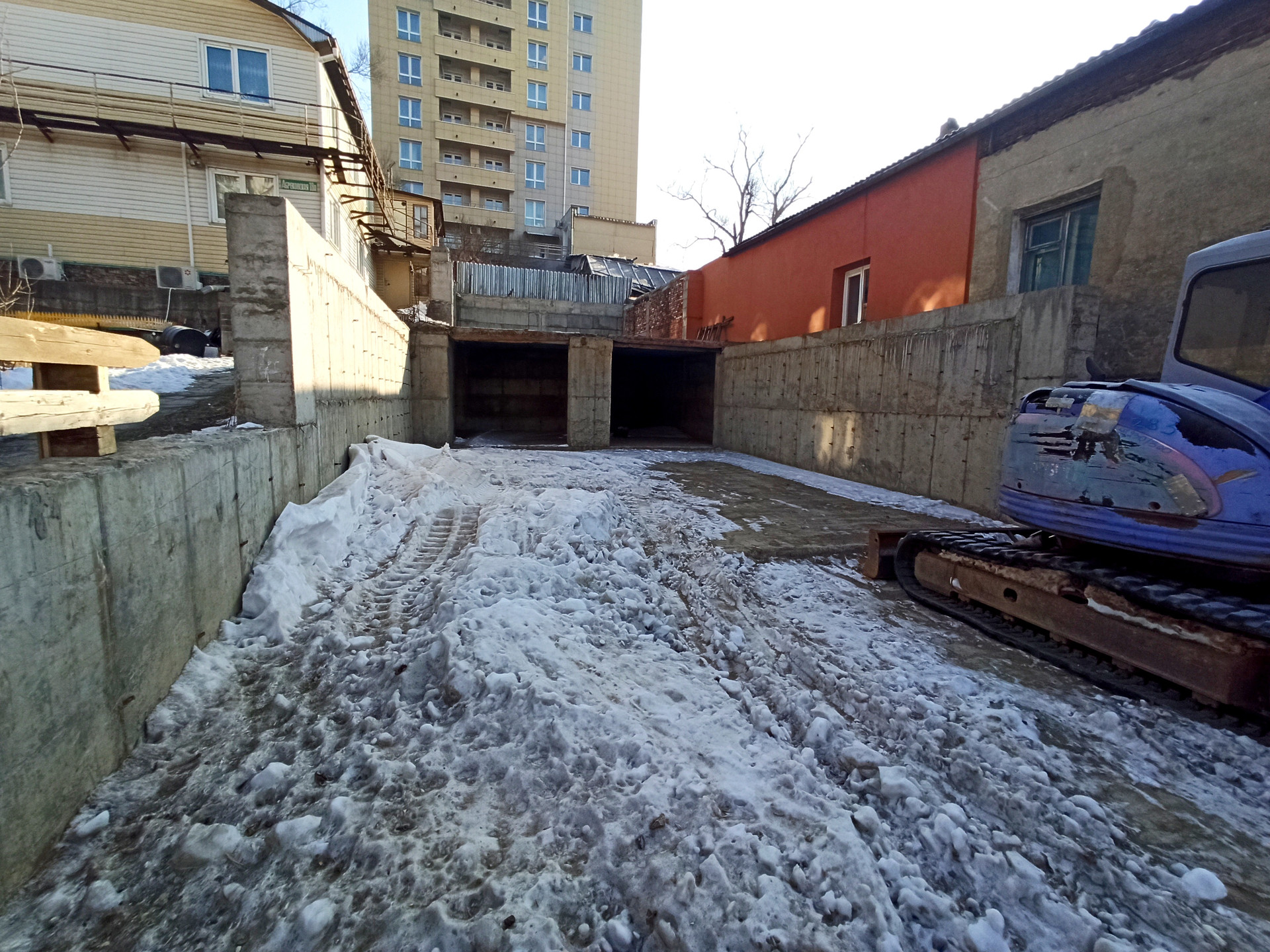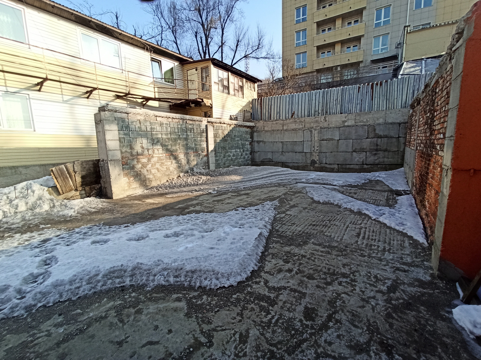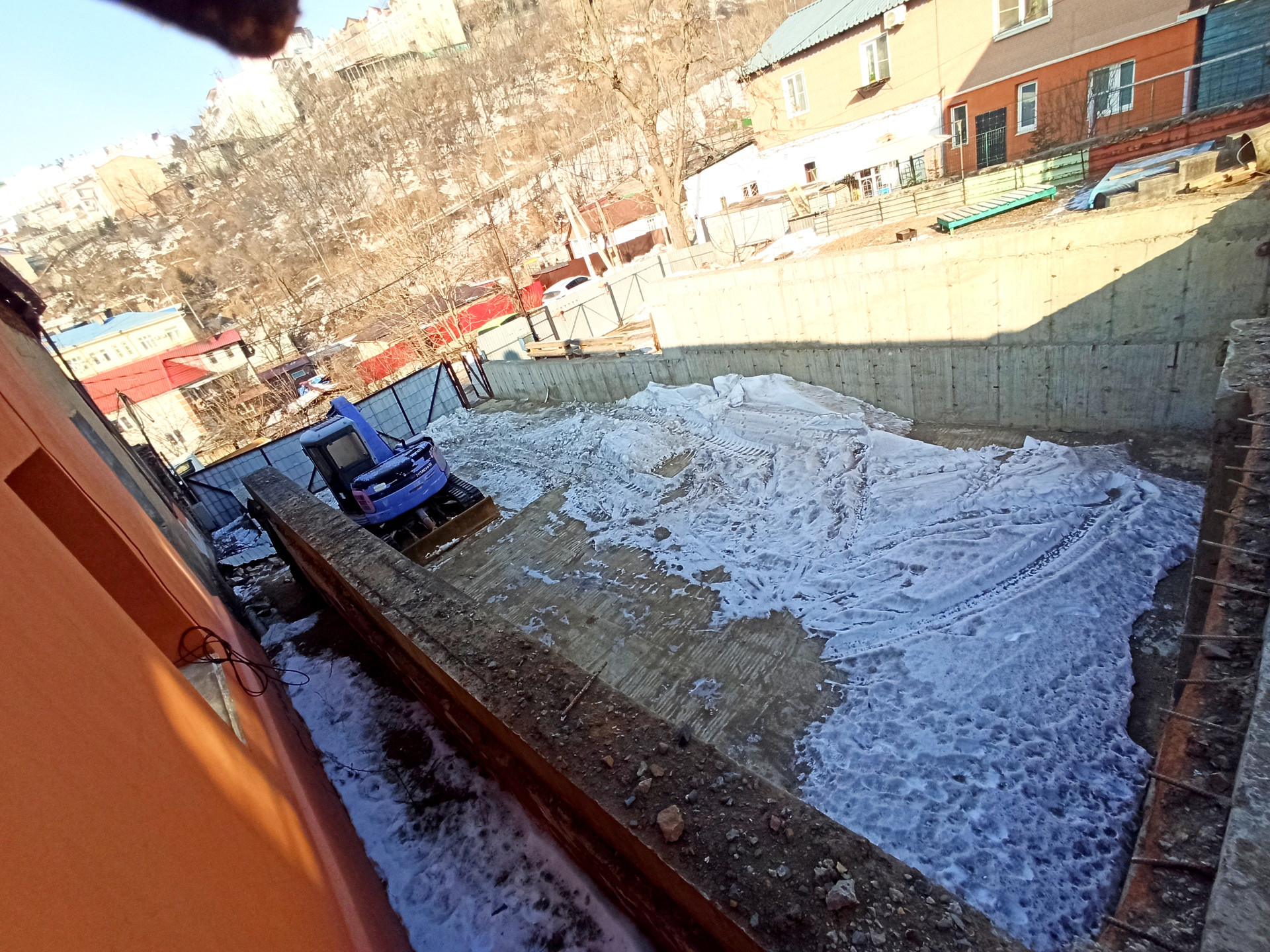 + Участок полностью забетонирован, сваи по периметру, полностью готовый фундамент под строительство. Бетонное основание под ограждение, частично возведено бетонное перекрытие второго этажа