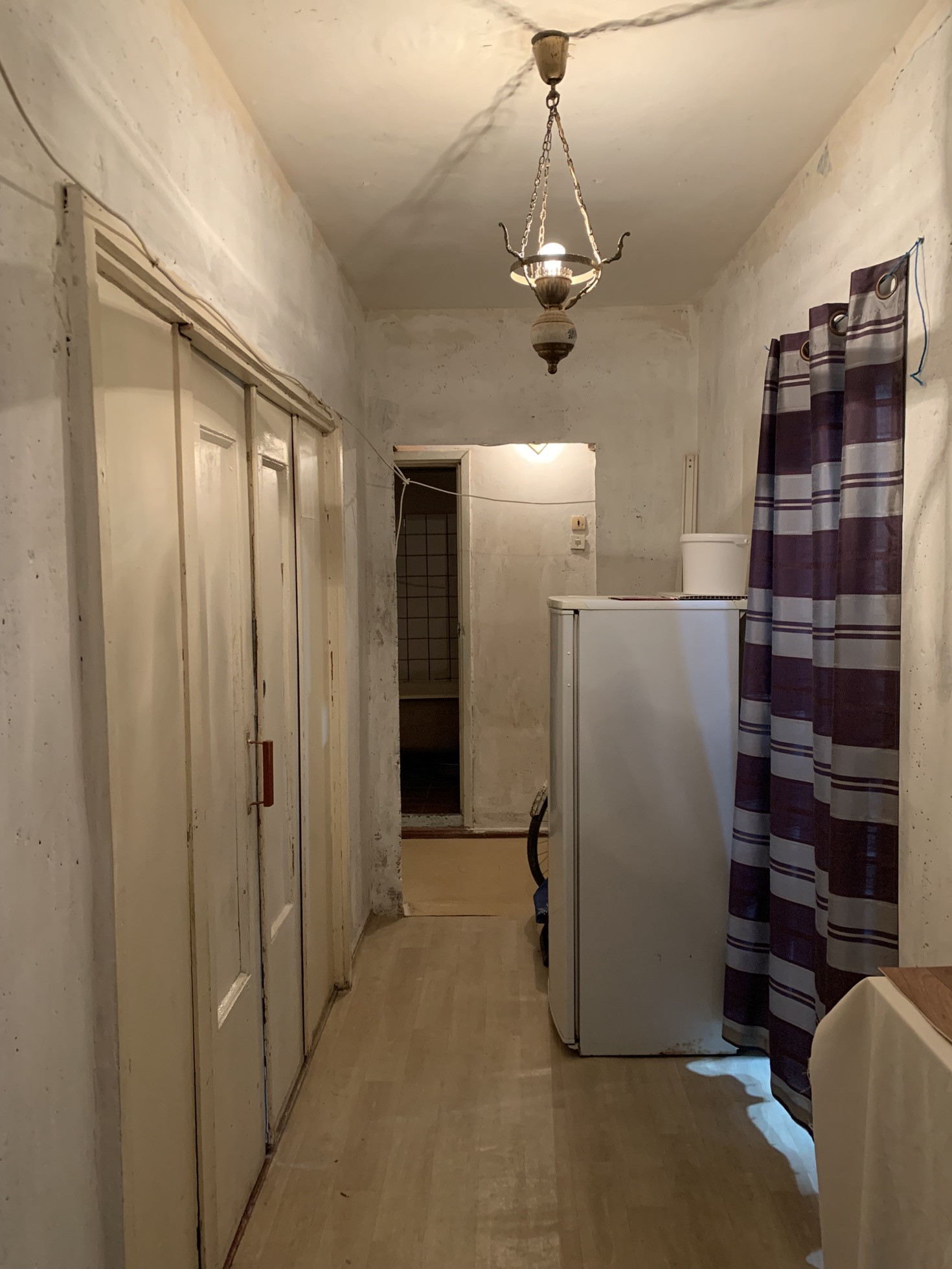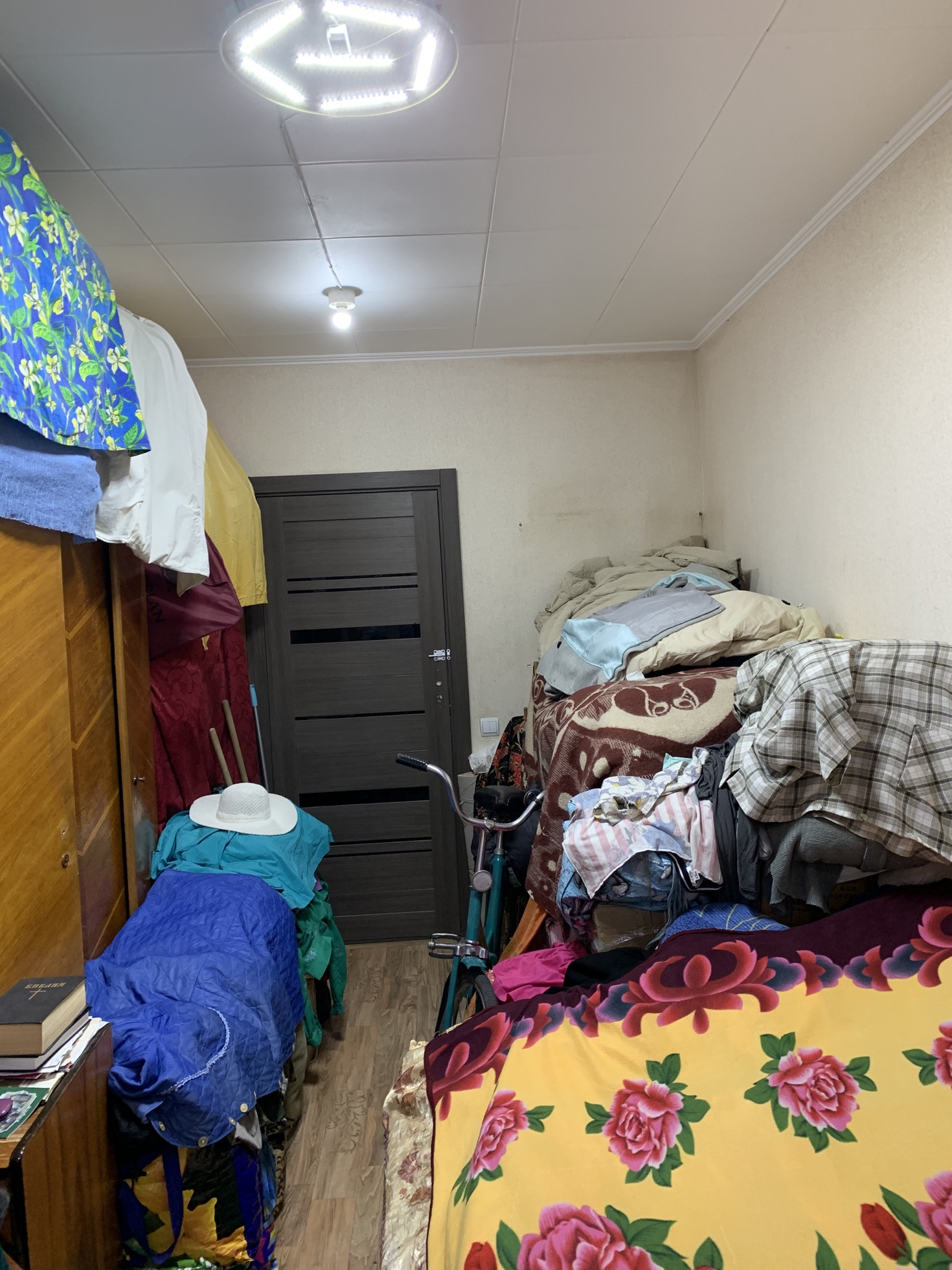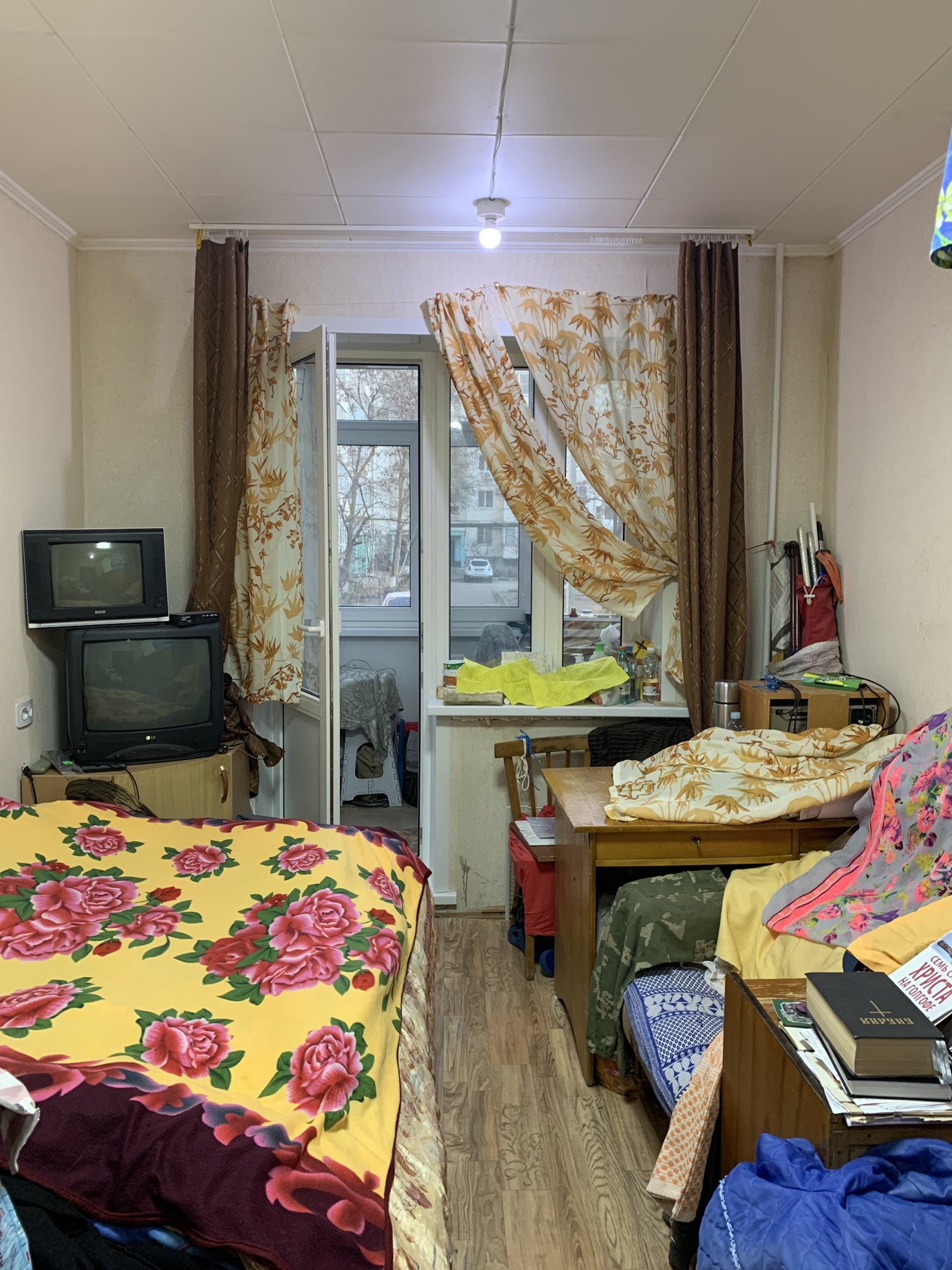 Комната с лоджией, которая застеклена новой рамой из пластика и отделана внутри пластиком. Есть подвал. Новое металлопластиковое окно. Новая входная дверь в комнату. Рядом в квартире живет семья: мать с дочерью.