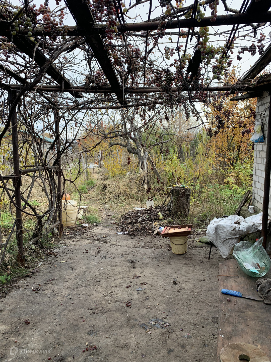 На участке много сортов винограда. Плодовые деревья. Ягоды.