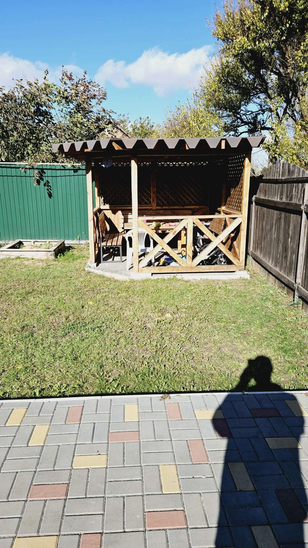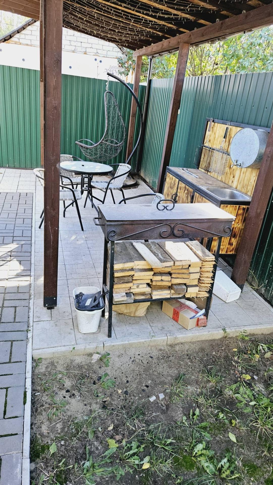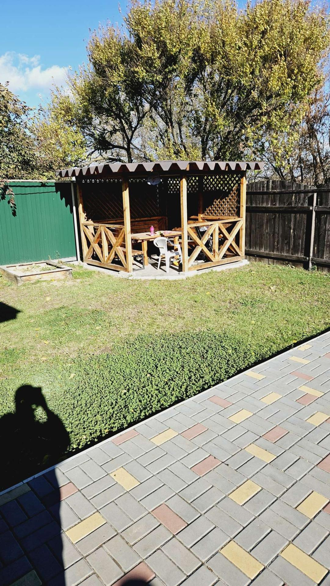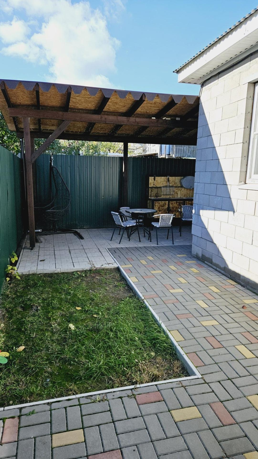 На участке брусчатка (красота под ногами), беседка из бруса, мангальная зона, навес с автоматическими воротами на 2 машины (10*5м), хозблок, площадка под бассейн (9*4м).