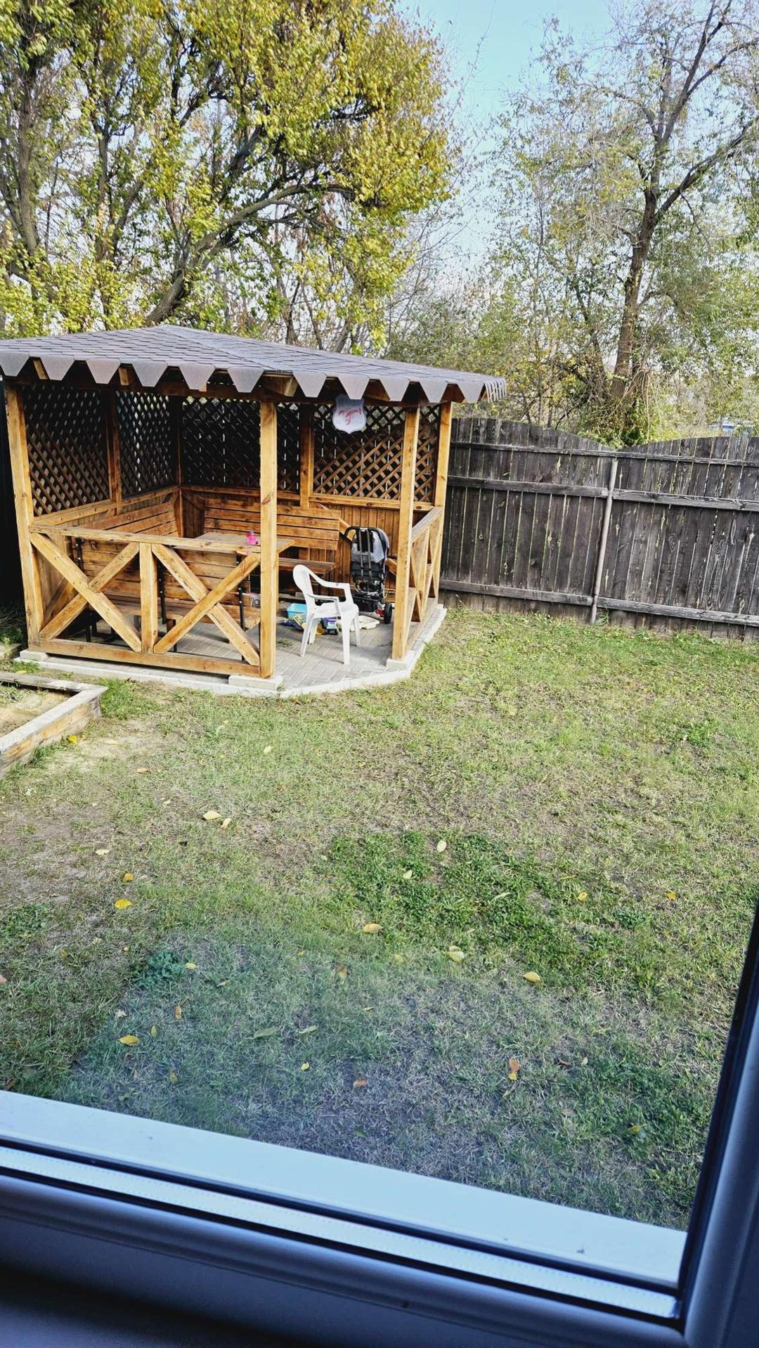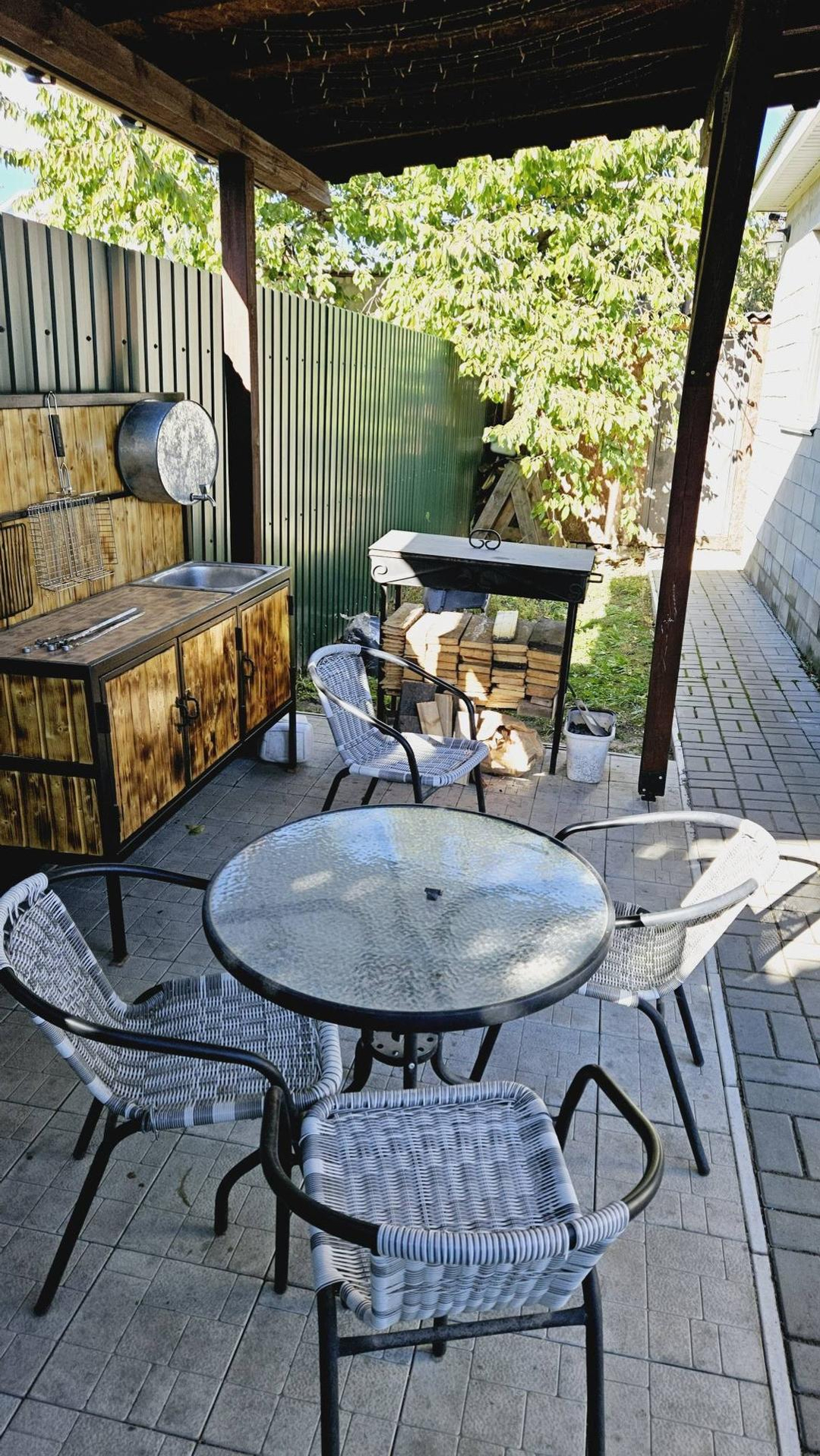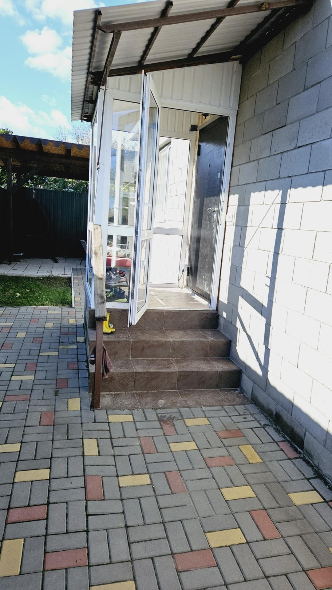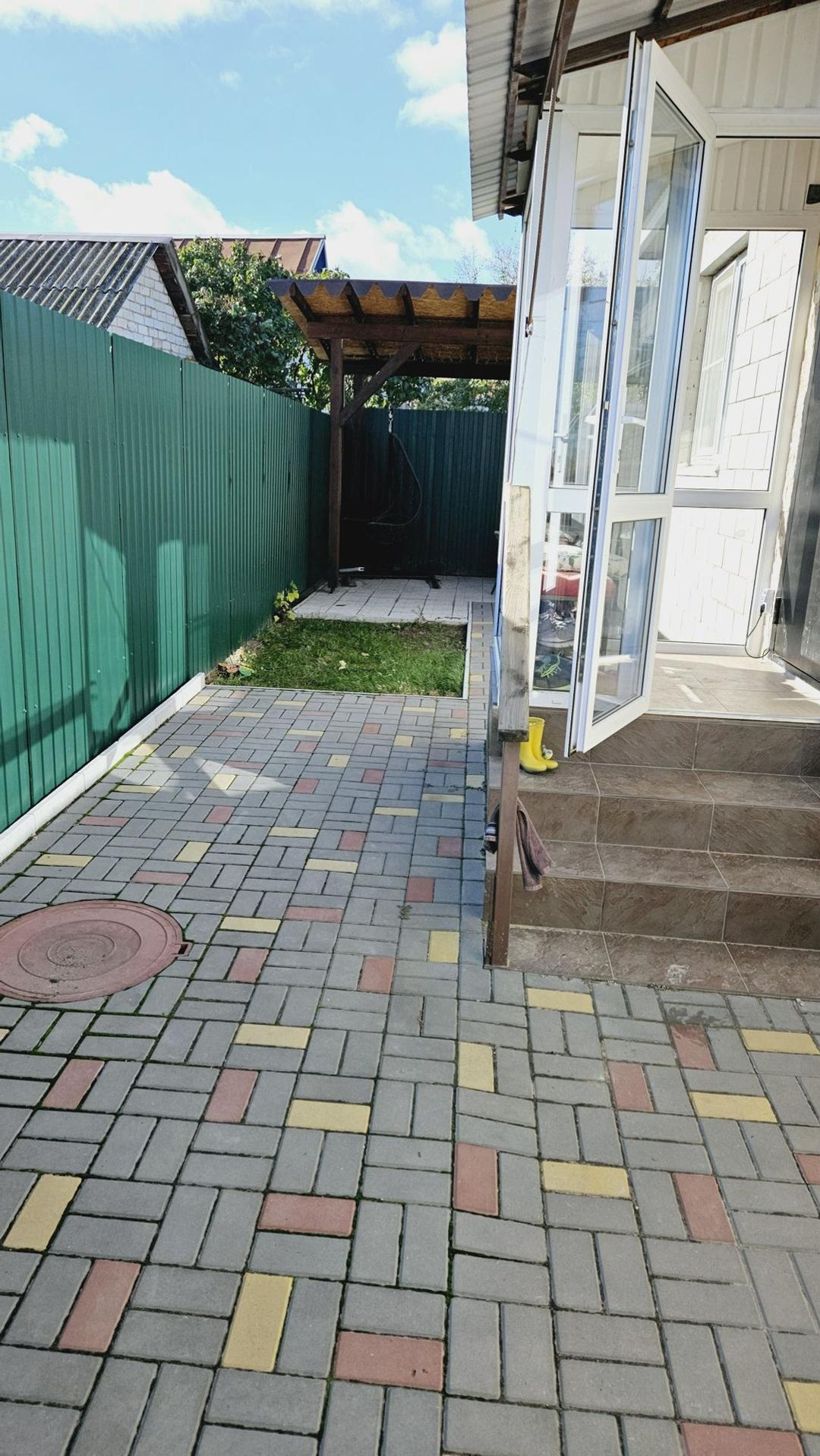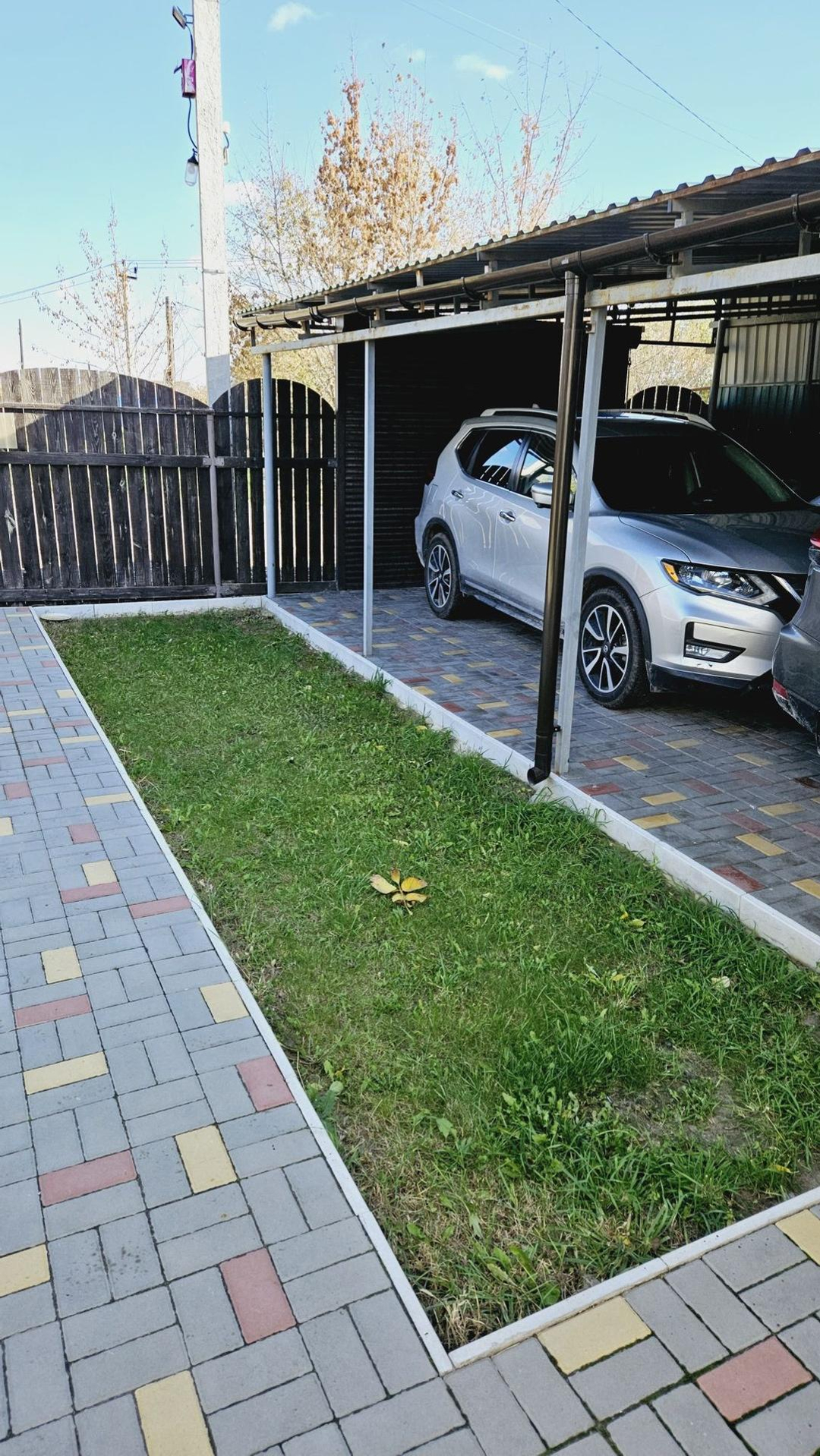 На участке брусчатка (красота под ногами), беседка из бруса, мангальная зона, навес с автоматическими воротами на 2 машины (10*5м), хозблок, площадка под бассейн (9*4м).