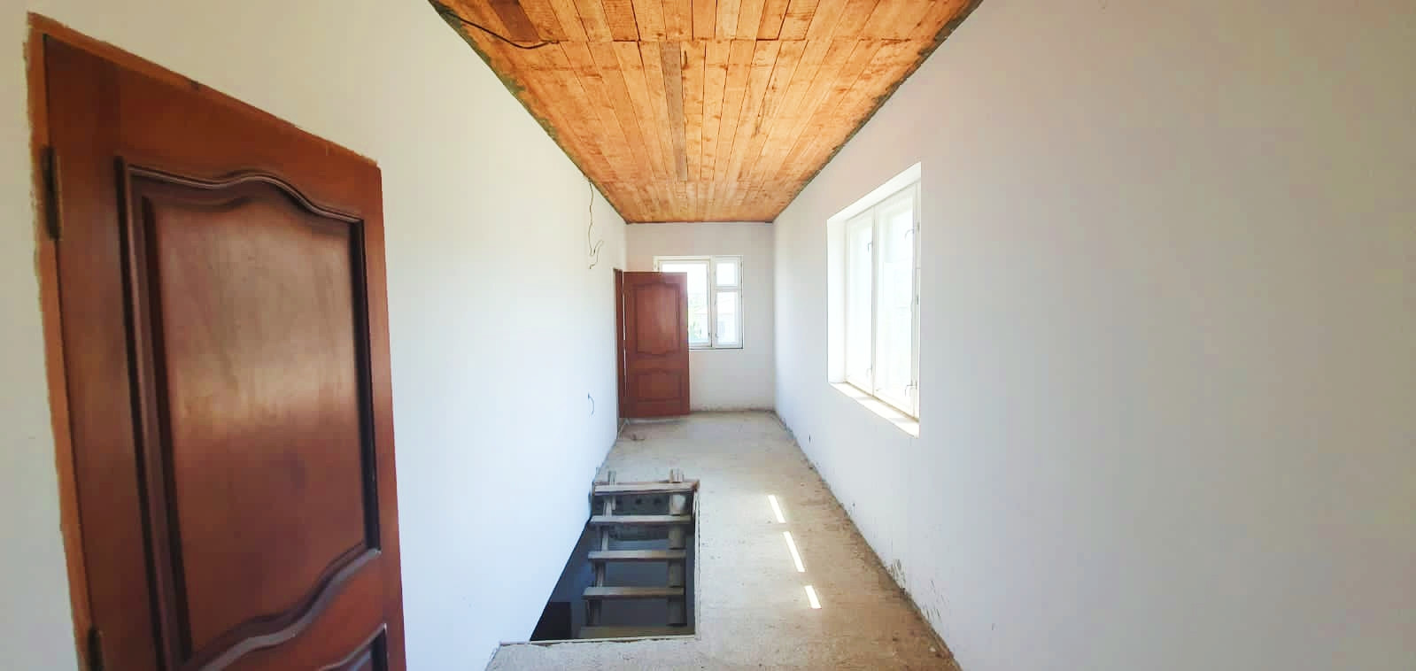 В доме цоколь и два этажа, на каждом этаже есть санузлы. Предчистовая отделка, все коммуникации заведены (газ, электричество , вода), стены оштукатурены, на всех дверных проёмах установлены деревянные межкомнатные двери.