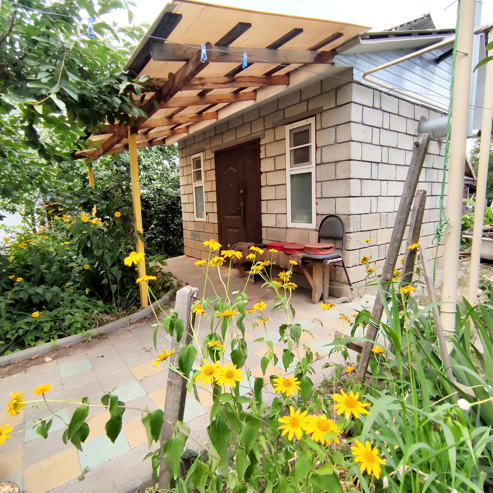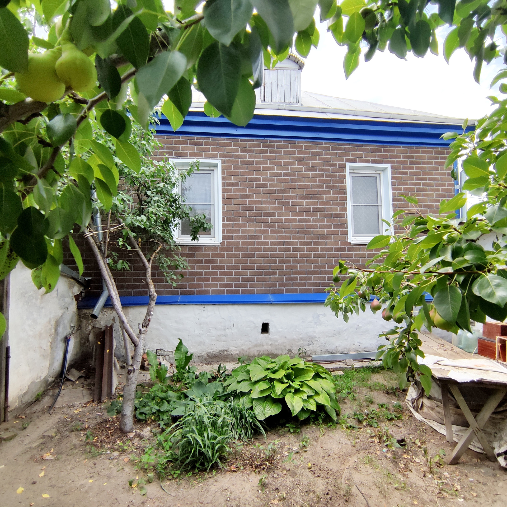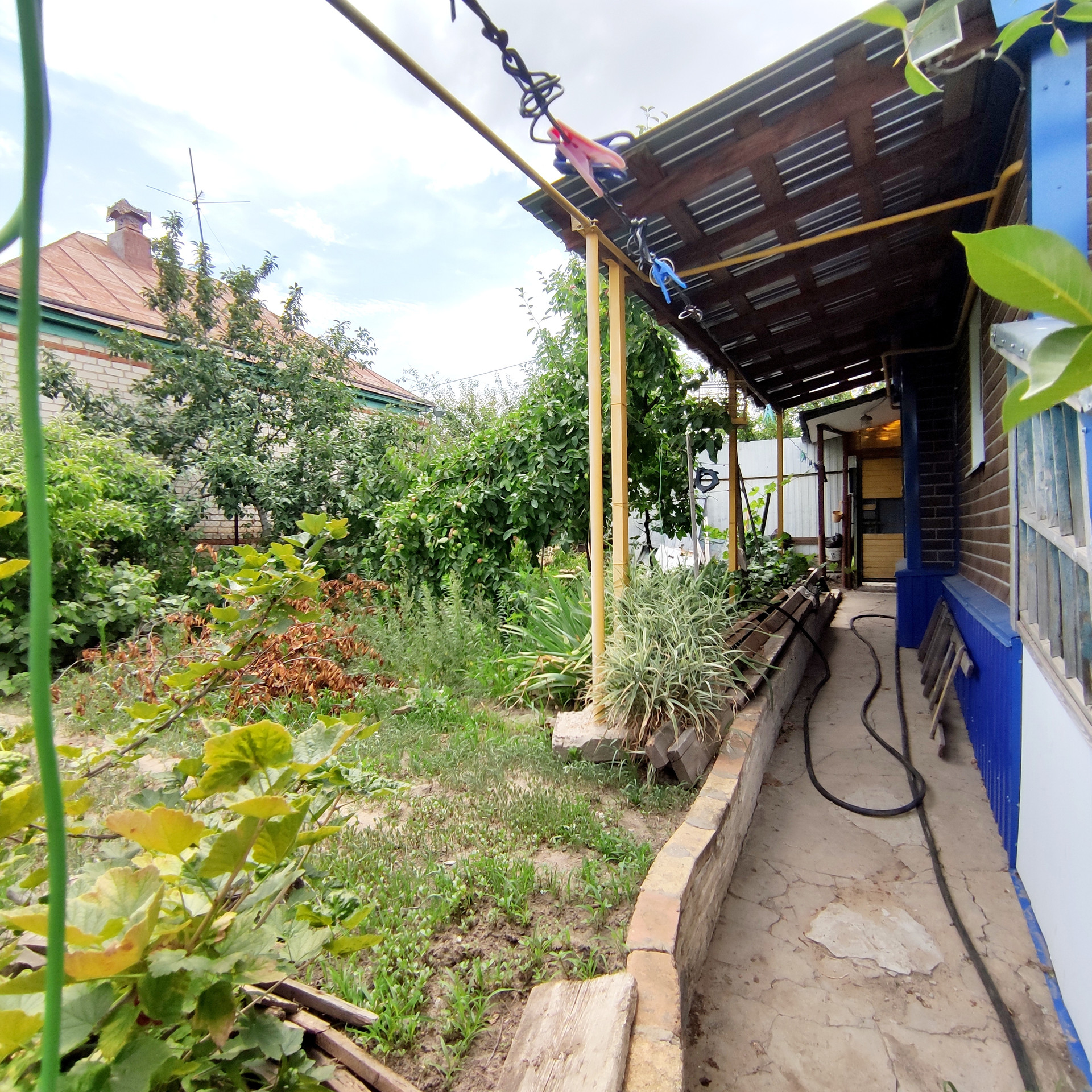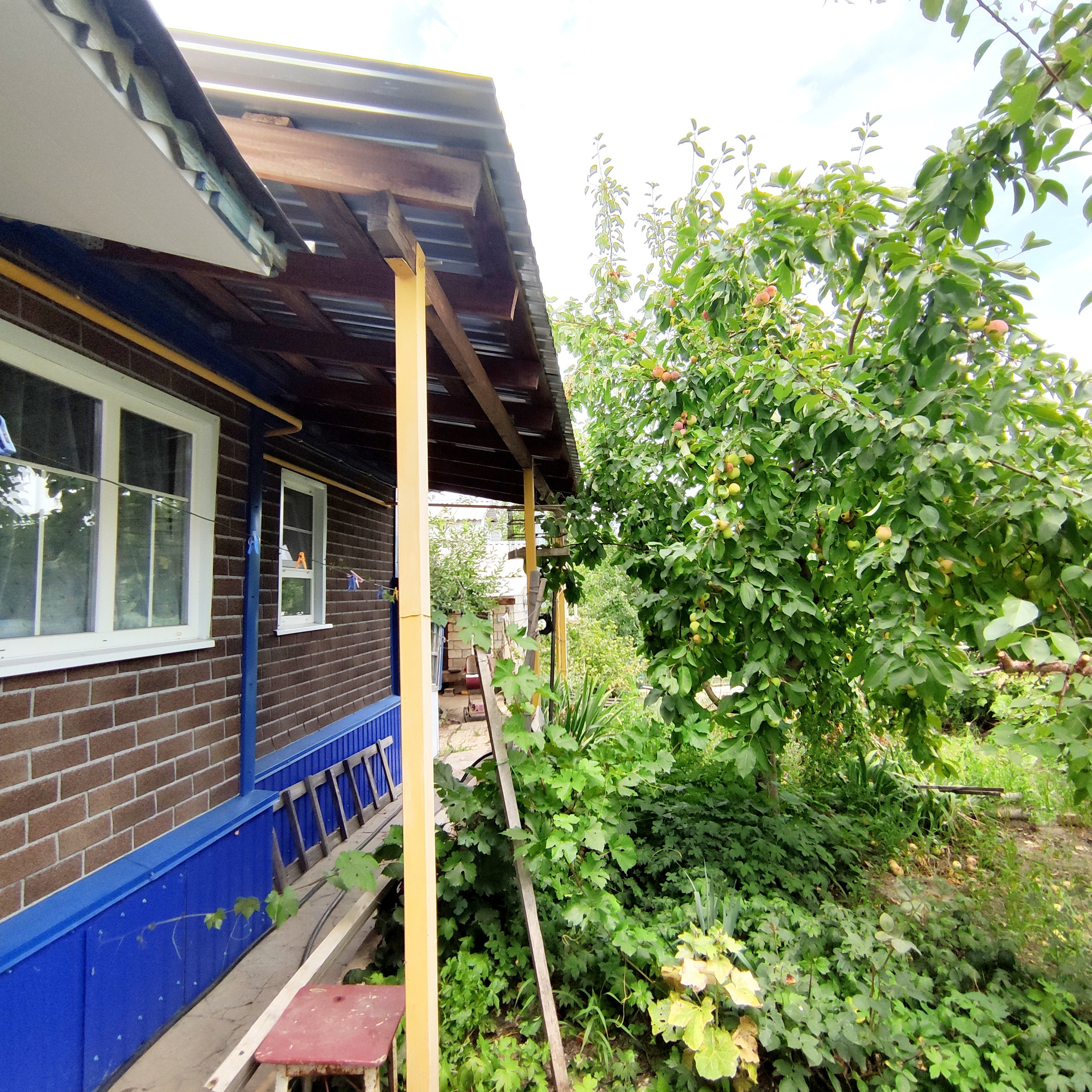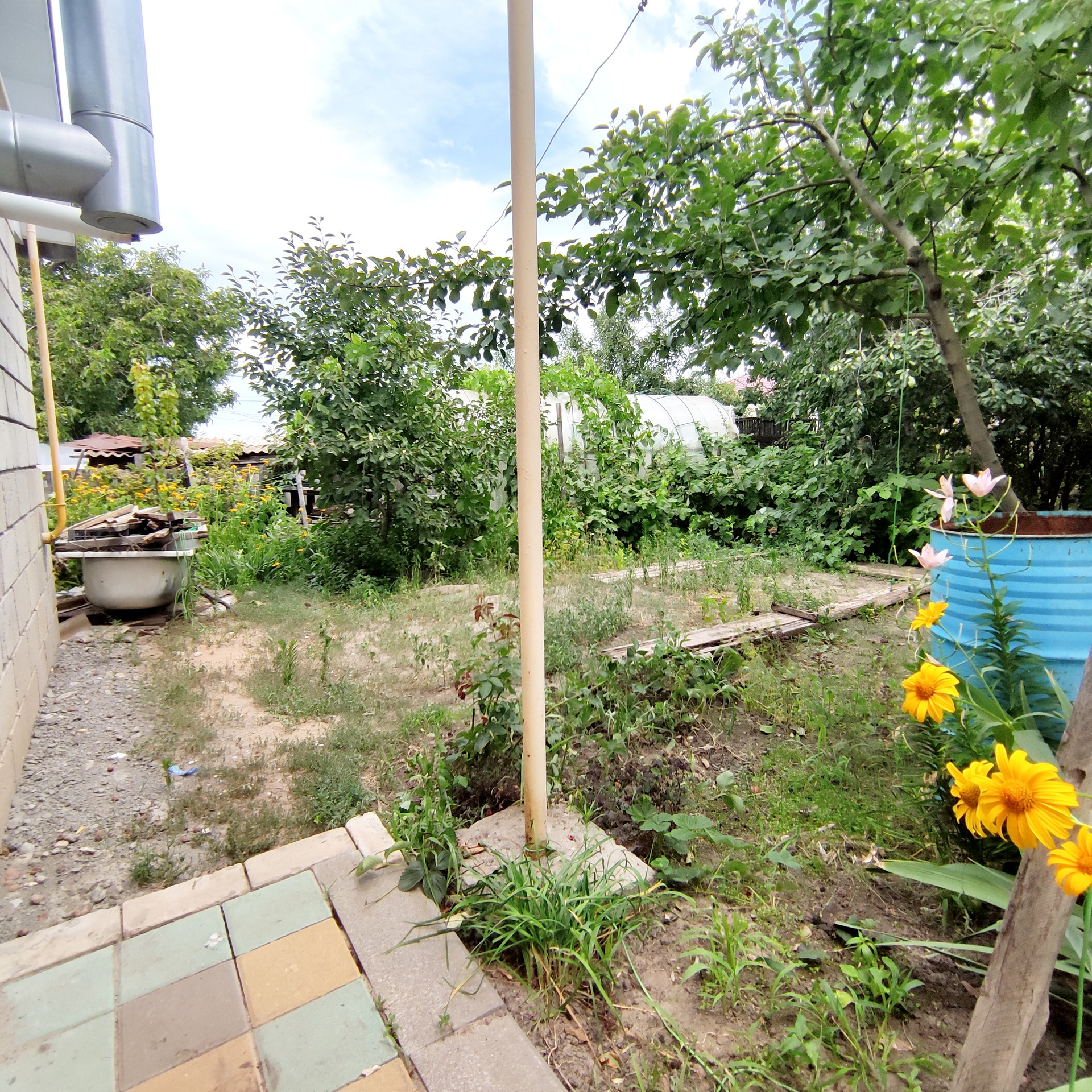 Участок хоть и небольшой, но есть плодовые деревья, теплица, огородик. Есть место для заезда машины.