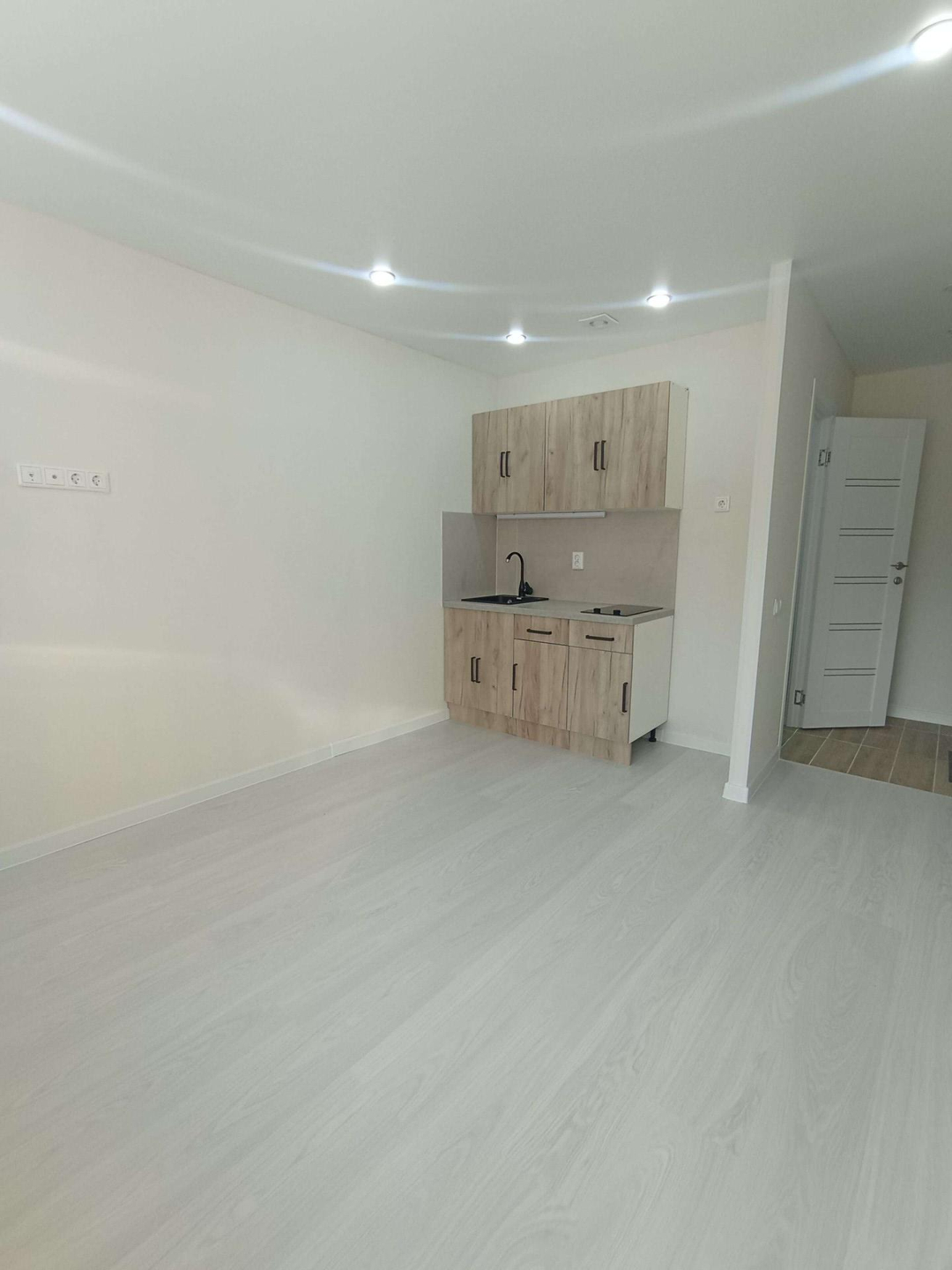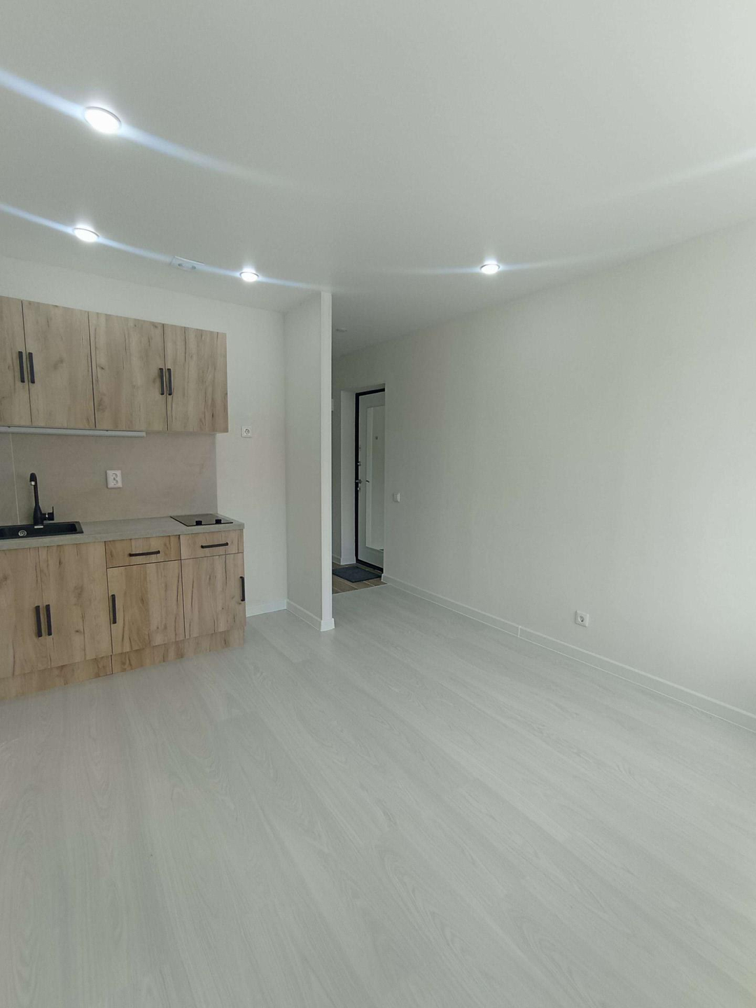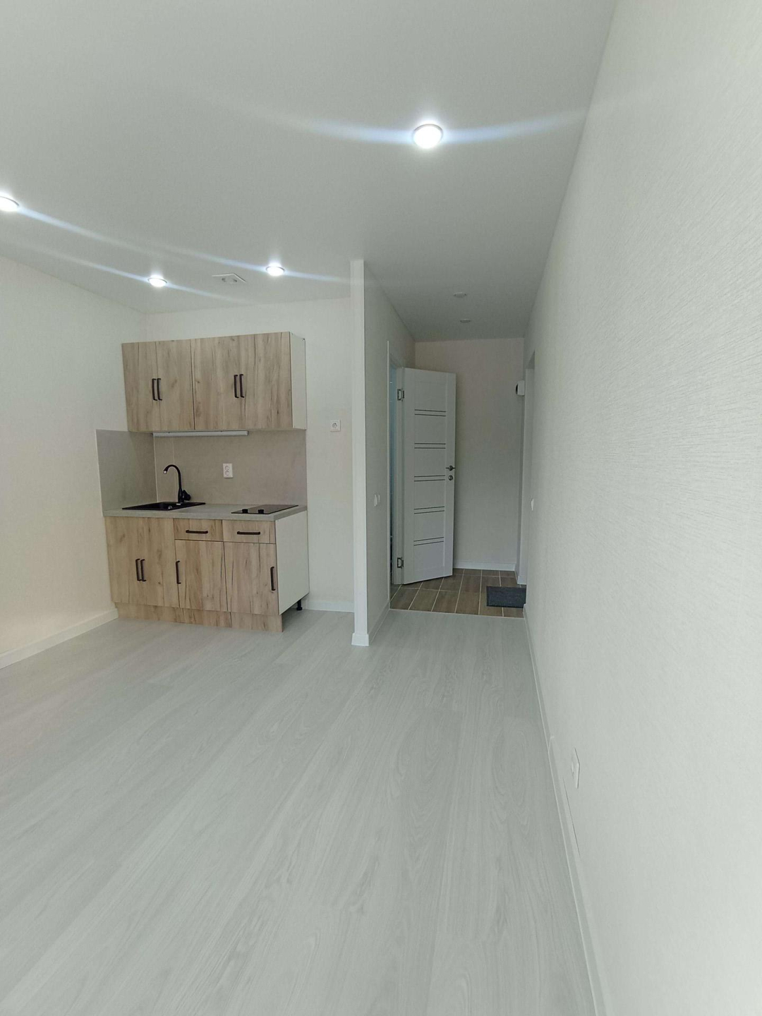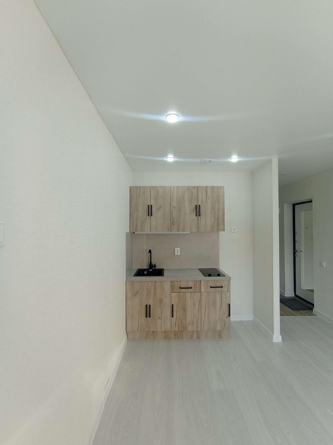 Выделена кухонная зона, куда установлен новый, встроенный кухонный гарнитур с варочной поверхностью и подсветкой.