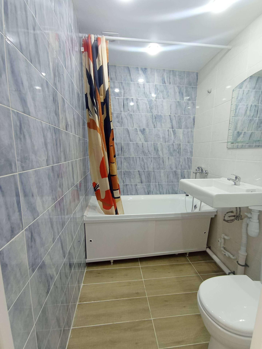 Санузел отделан кафелем, под раковиной оборудовано место под стиральную машину.