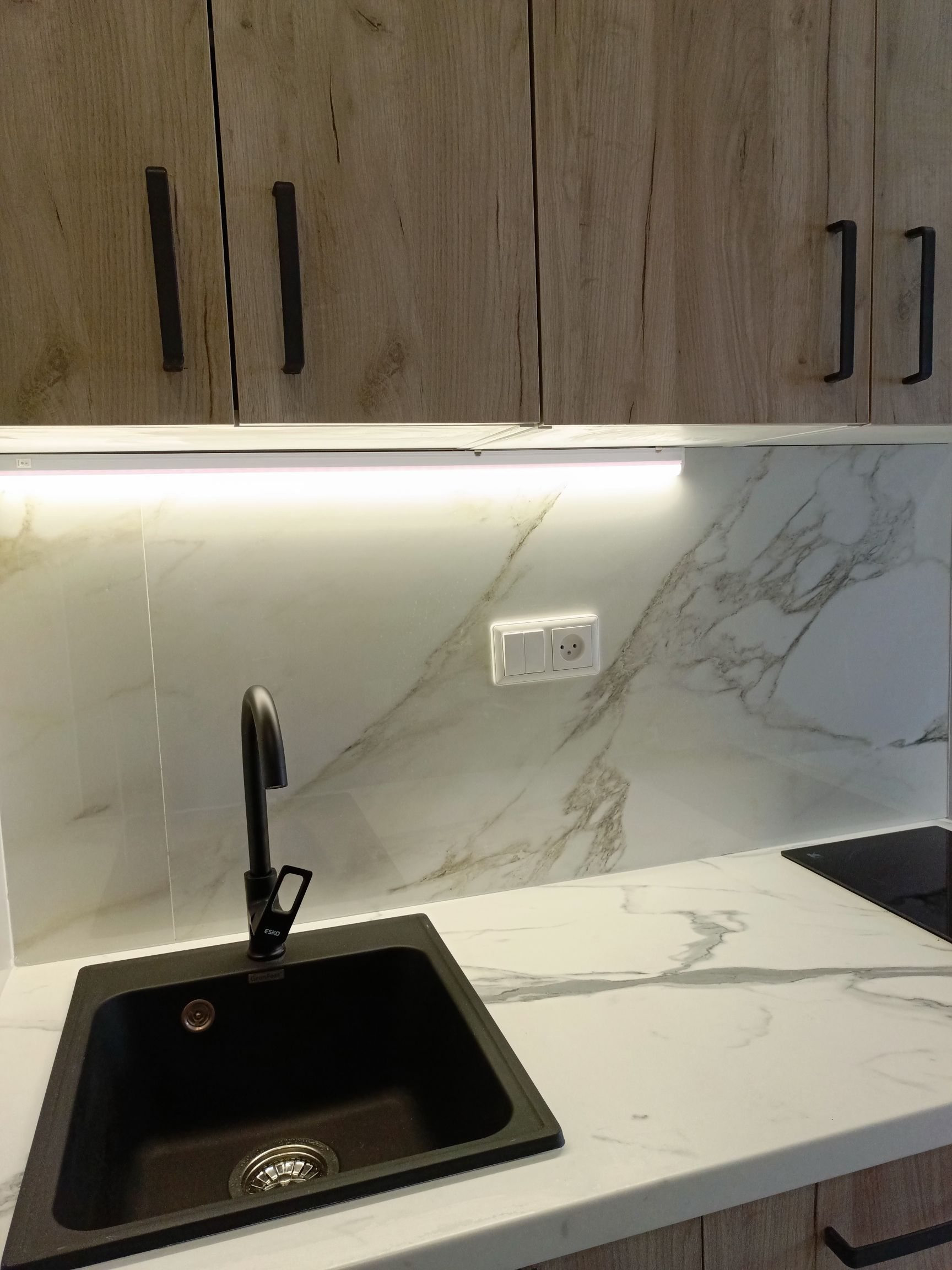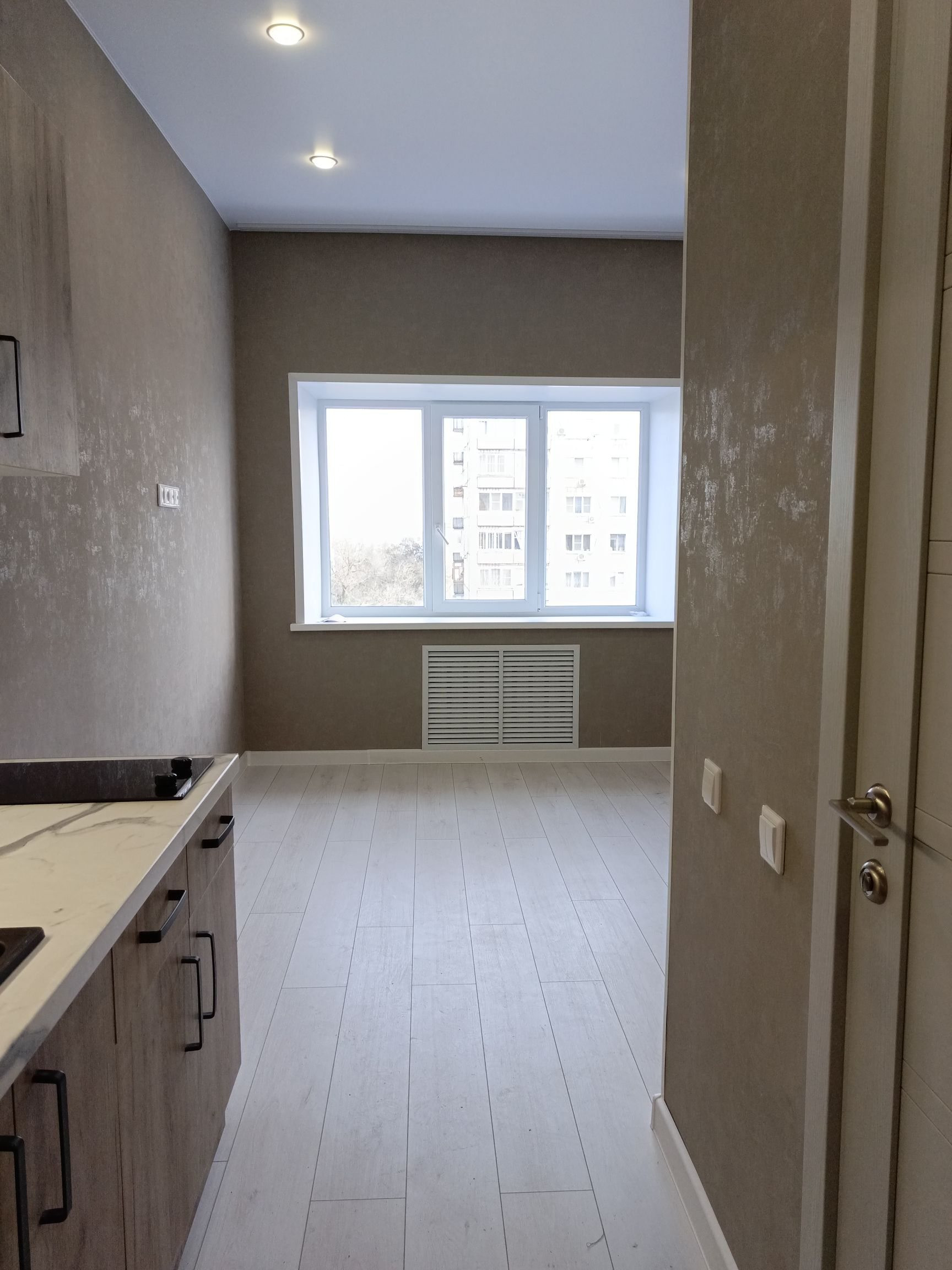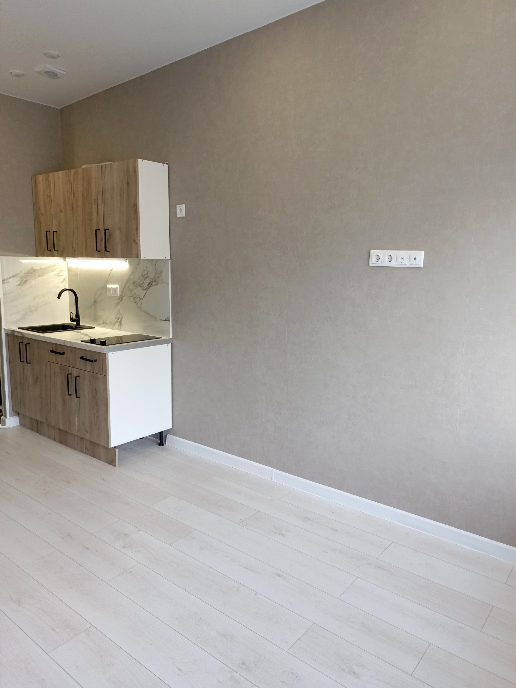 Выделена кухонная зона, куда установлен новый, встроенный кухонный гарнитур с варочной поверхностью и подсветкой, а справа от него оборудовано место под холодильник.
