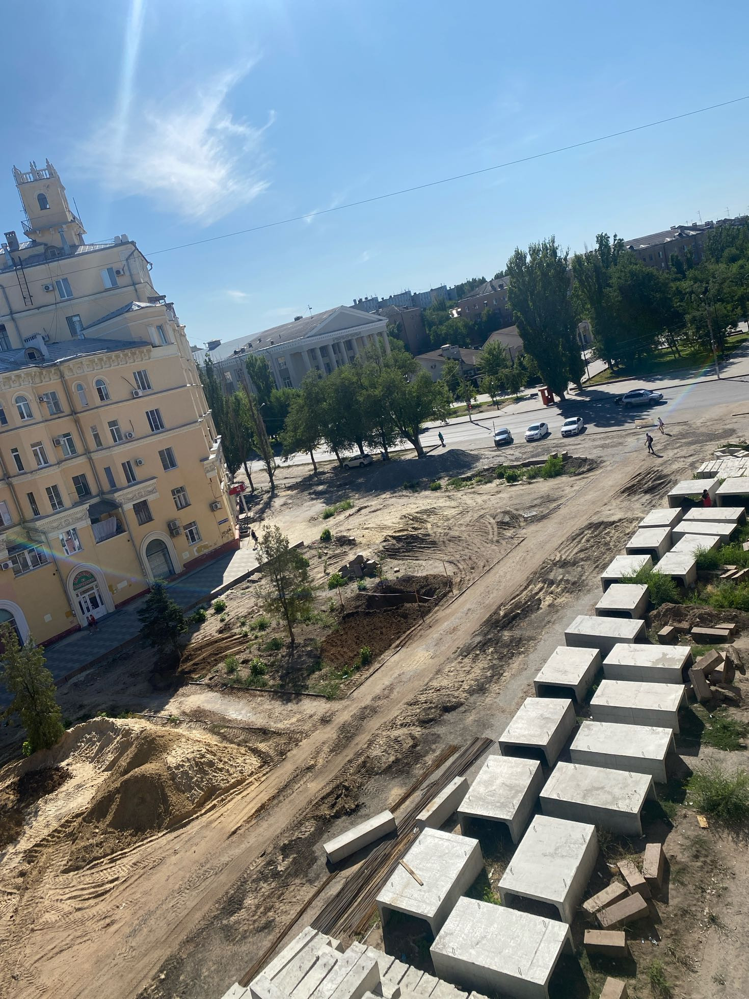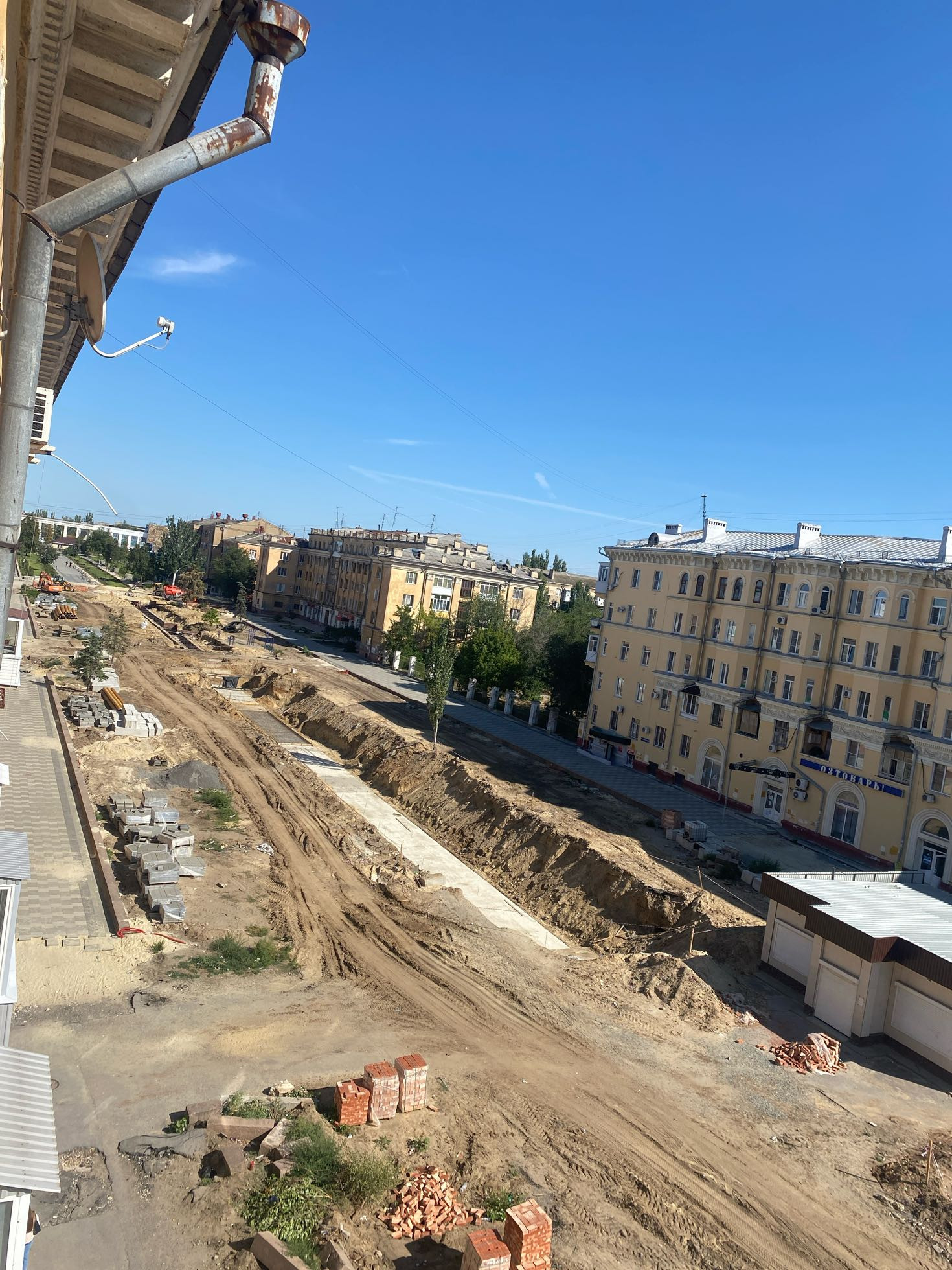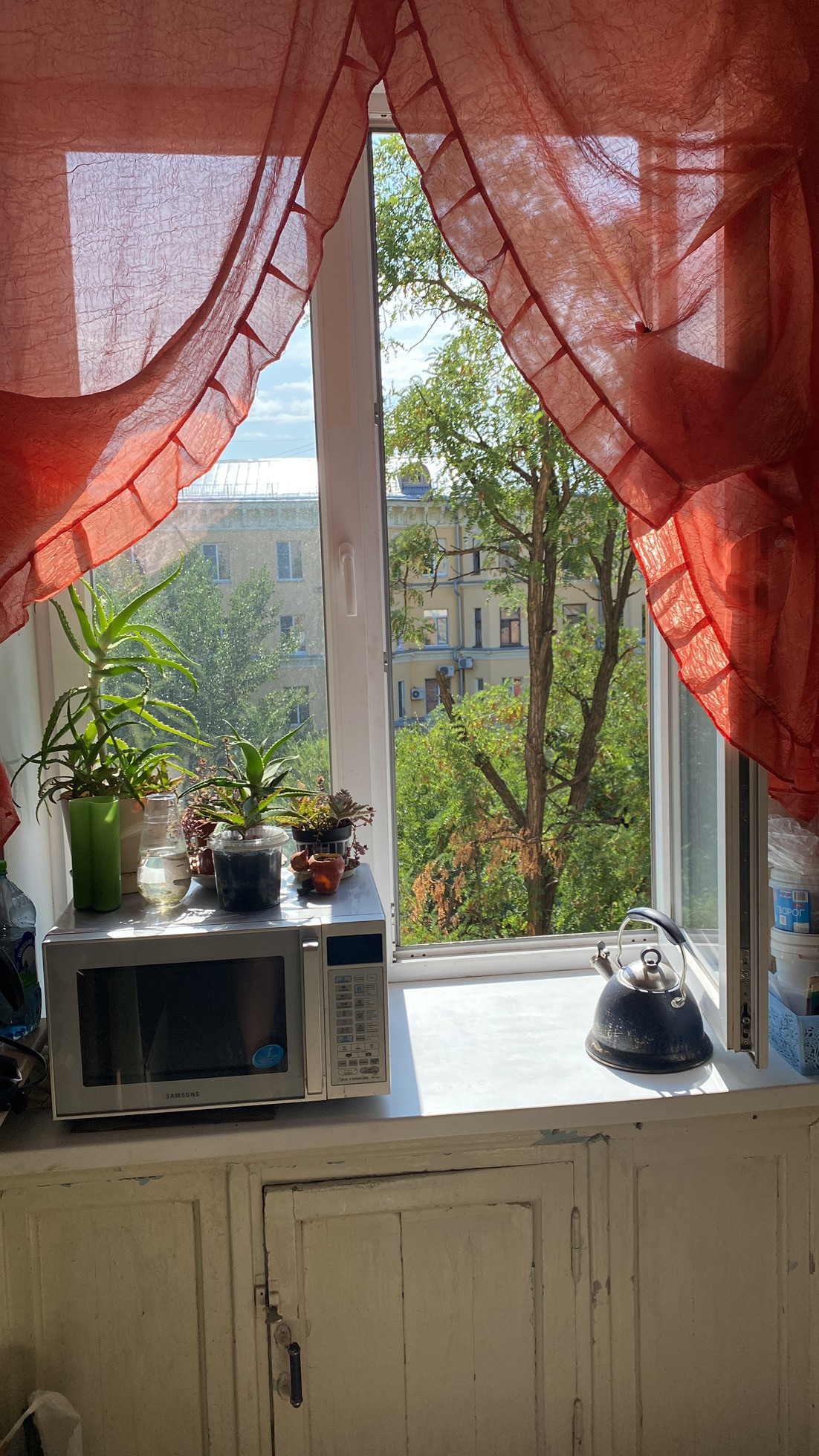 Окна комнат во двор,окно кухни на аллею,в данный момент идёт огромная реконструкция с заменой коммуникаций и полным облагораживанием территорий