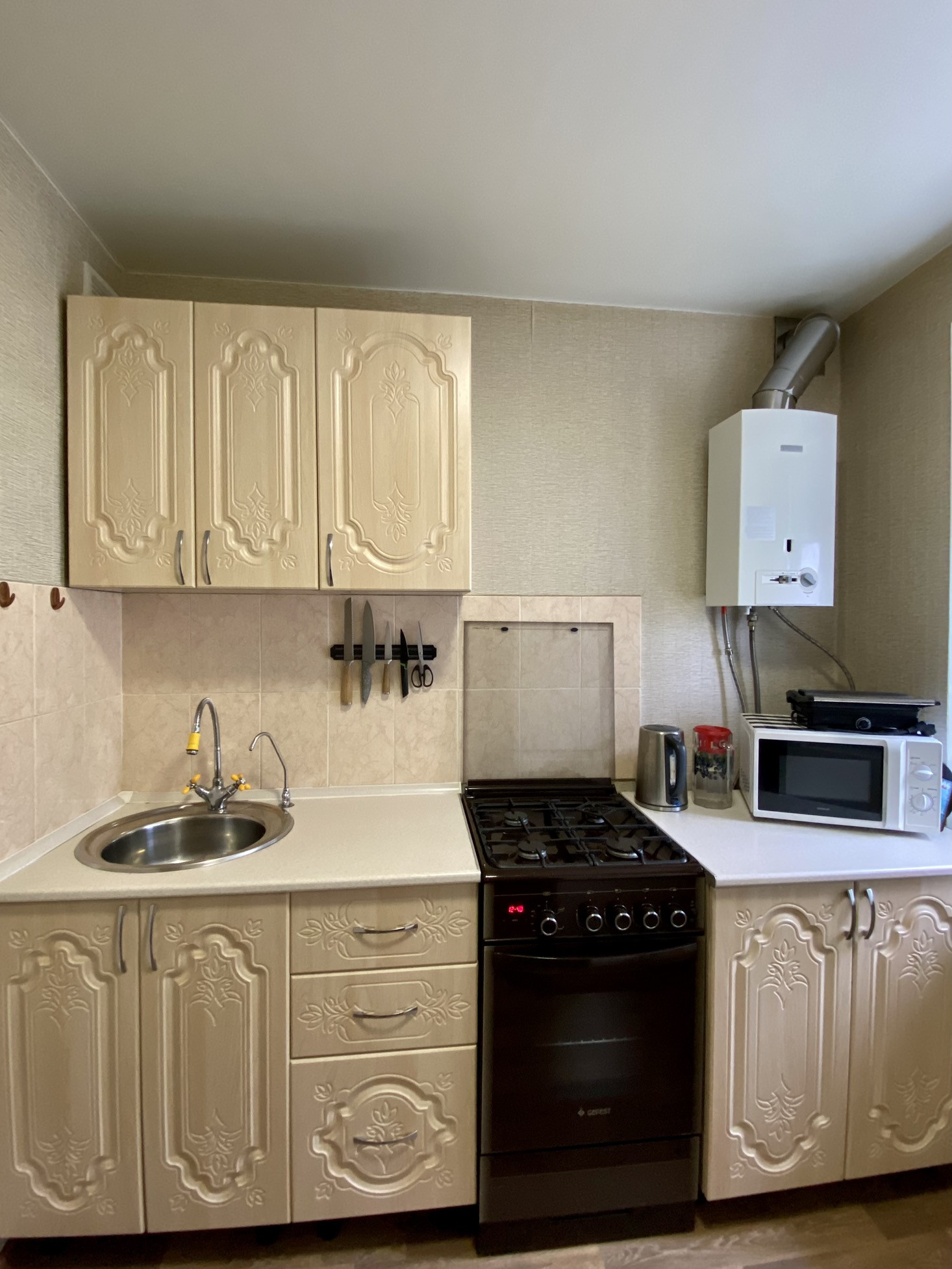 В квартире сделан качественный ремонт (новая сантехника, натяжные потолки, ванная, пластиковые окна, утепленный балкон), новая газовая колонка, газовая плита. Так же остается мебель на кухне и встроенный шкаф-кладовая в коридоре.