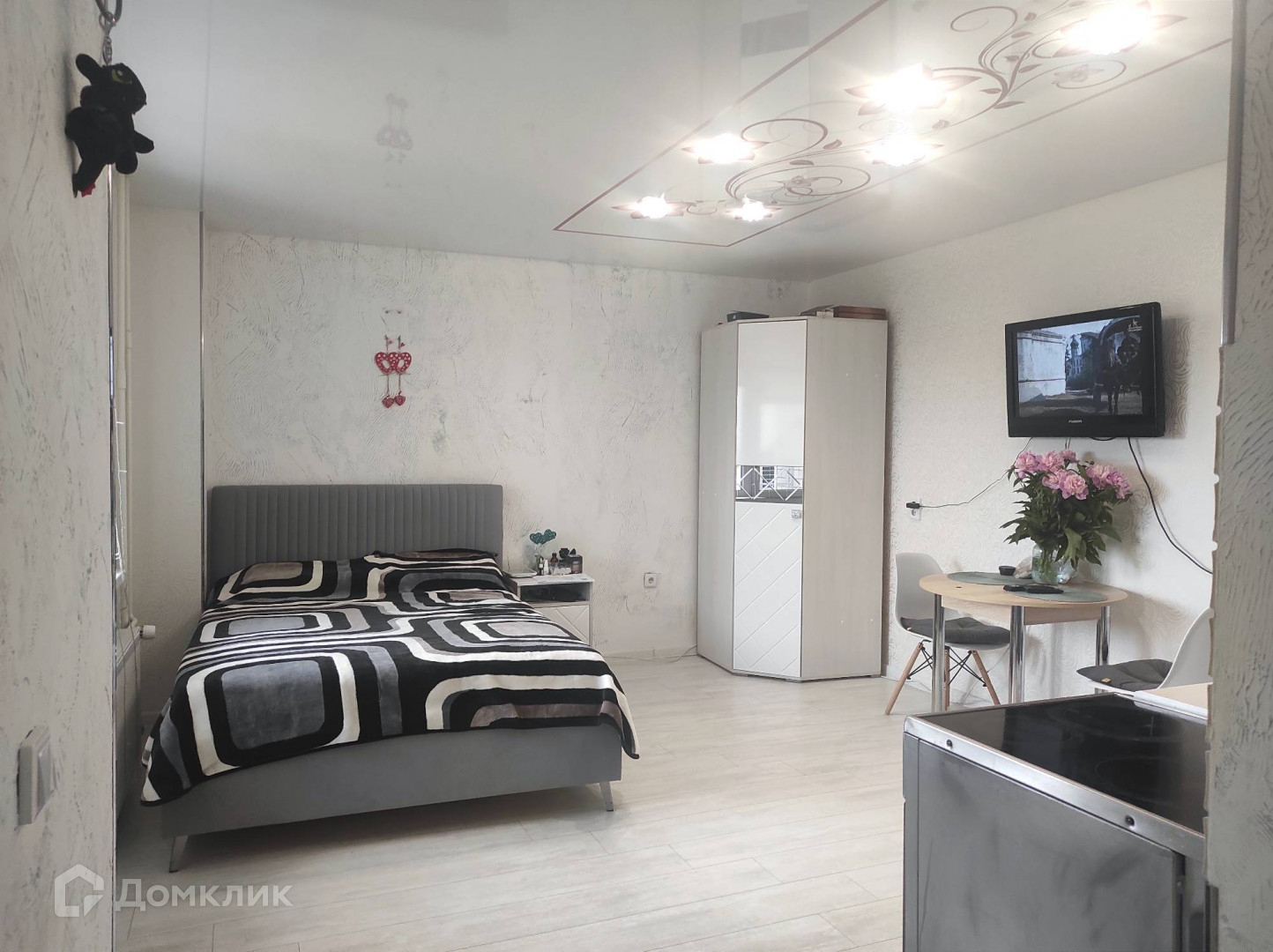 СОСТОЯНИЕ: Натяжной потолок везде. Комната и коридор покрыты ламинатом. Большой санузел отделан керамогранитом. Отделка стен декоративной штукатуркой привносит фактурный и стильный акцент в интерьере, прекрасно дополняя лаконичный дизайн студии.