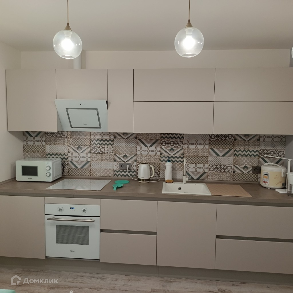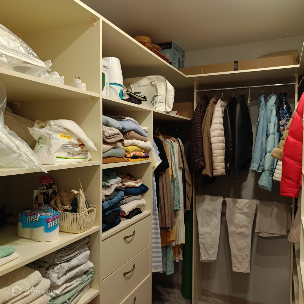 Новому собственнику квартиры остается кухонный гарнитур от мастерской кухонной мебели «Едим Дома!» со встроенной техникой, спальный гарнитур (кровать с мягким изголовьем, тумбочки, комод), система хранения в гардеробной.