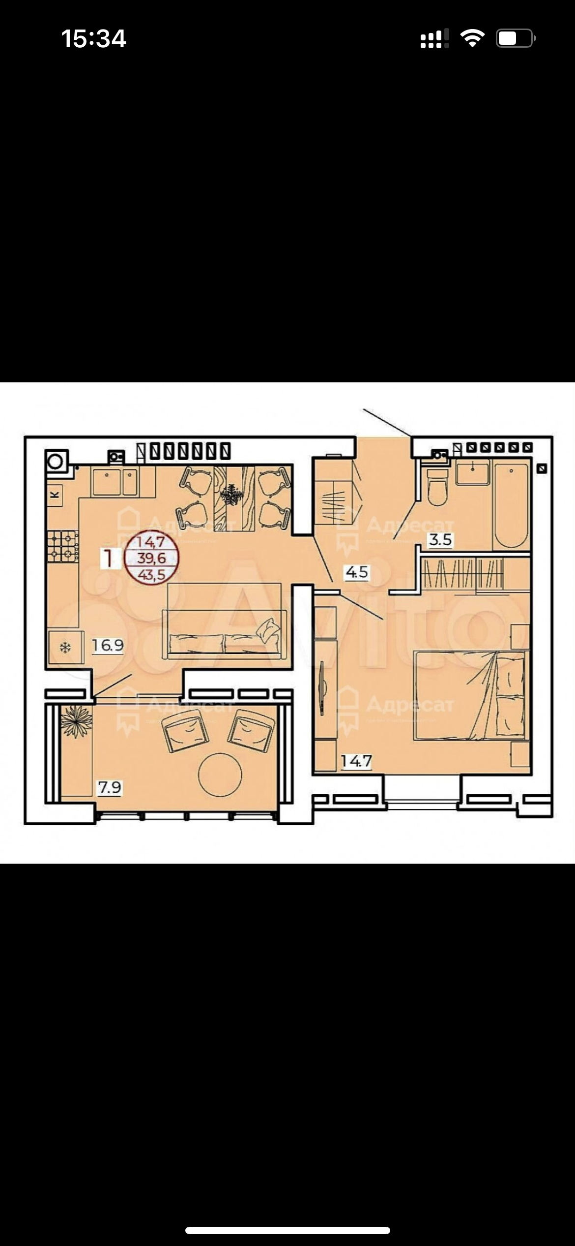 Общая площадь 39.6 м2