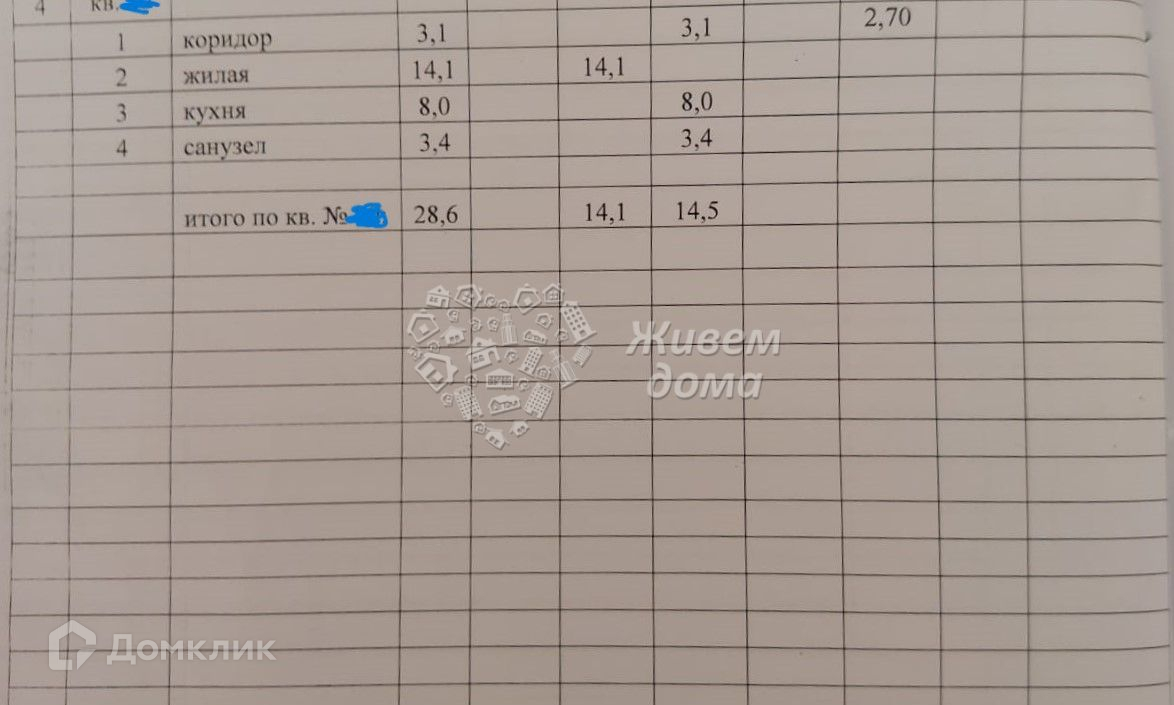 Планировка: общая 28.60 / жилая 14.10 / кухня 8.00