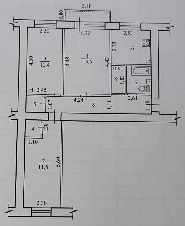 Высота потолков 2.45 м