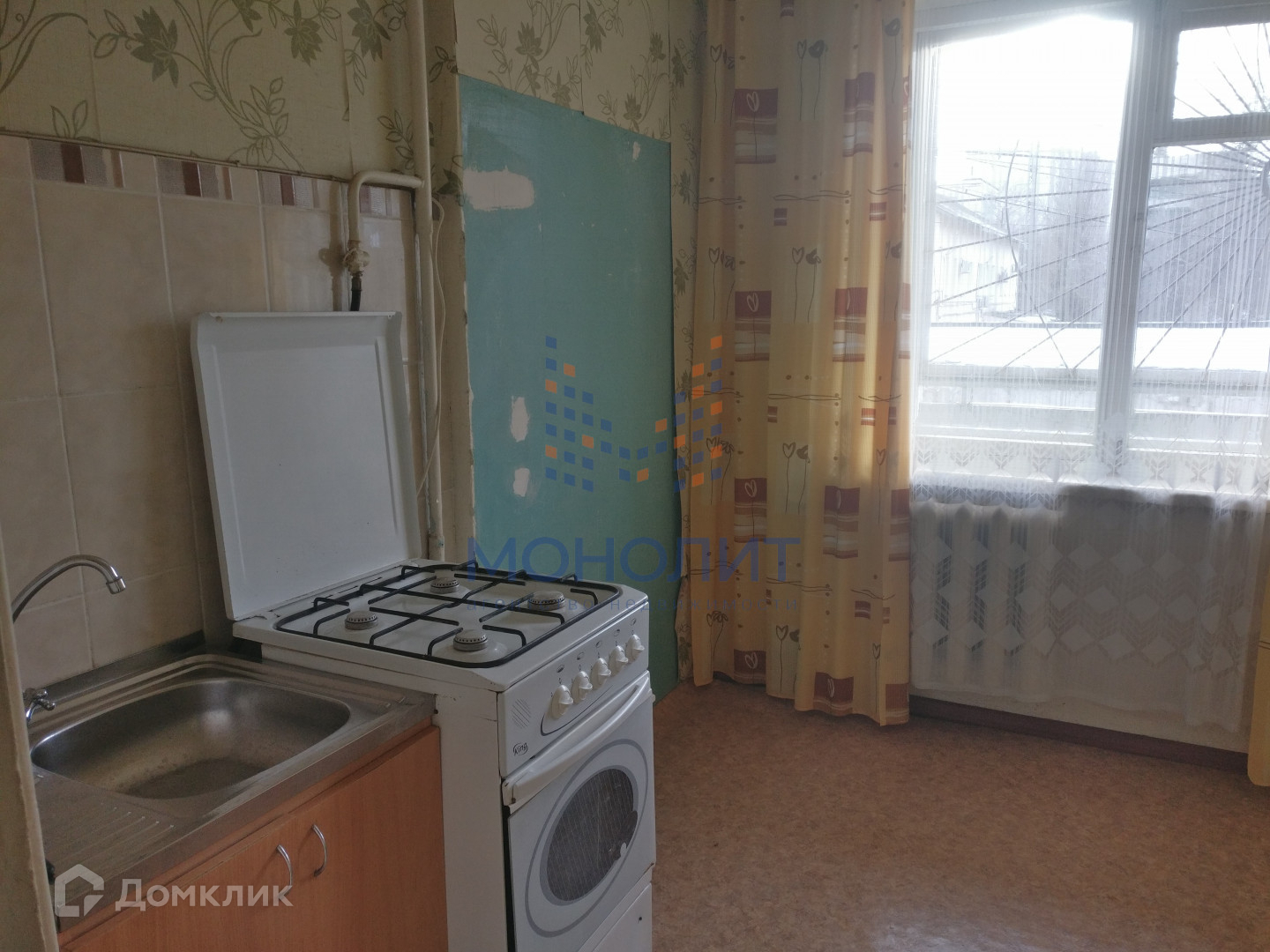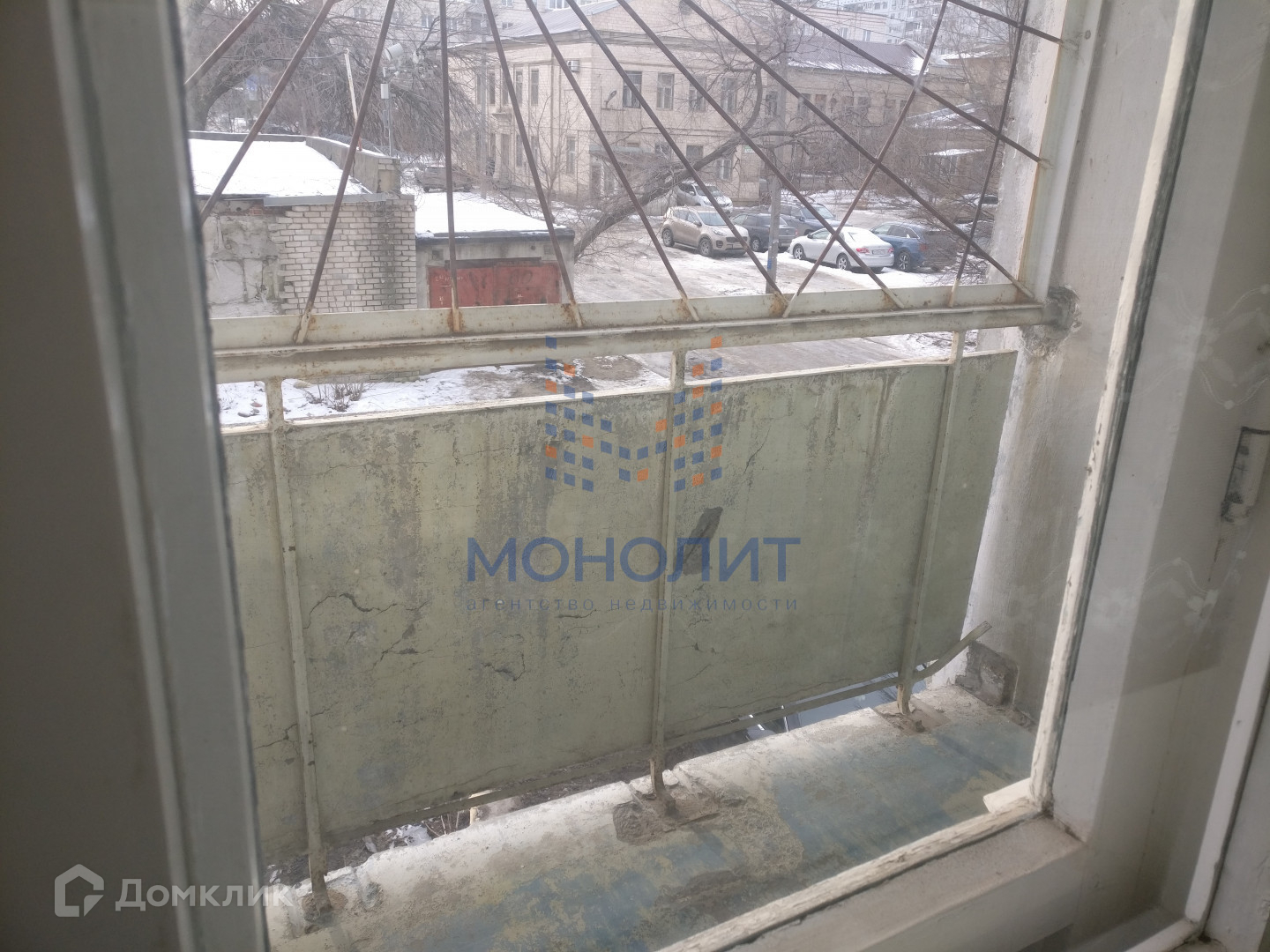 - балкон на всю длину кухни и комнаты, на балконе решетка.