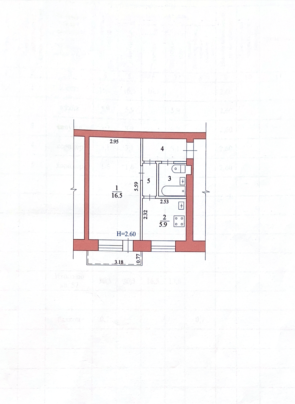 Квартира oбшeй площадью - 30,3 кв.м, жилой площадью 16,5 кв.м, кухня - 5.9 кв.м