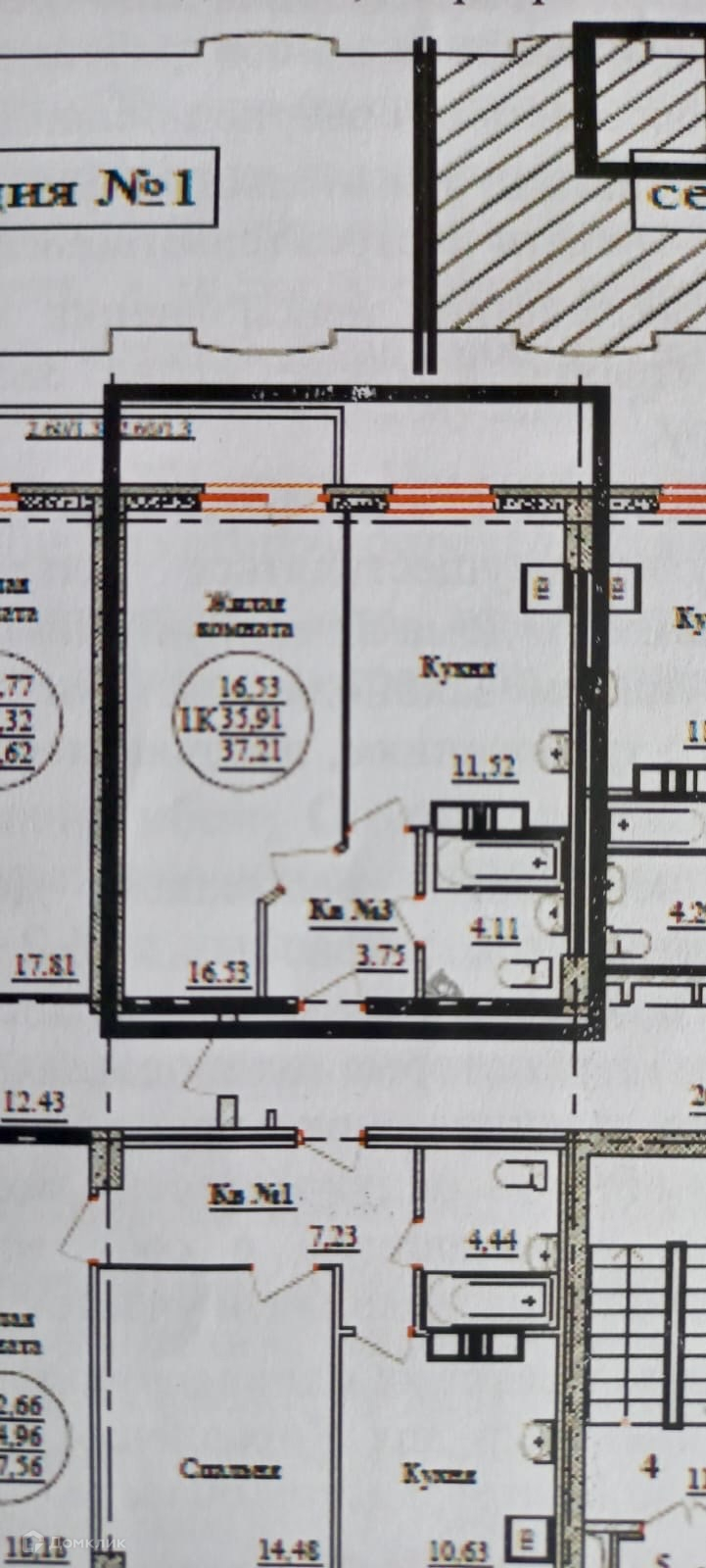 Планировка: общая 35.00 / жилая 16.53 / кухня 11.52
