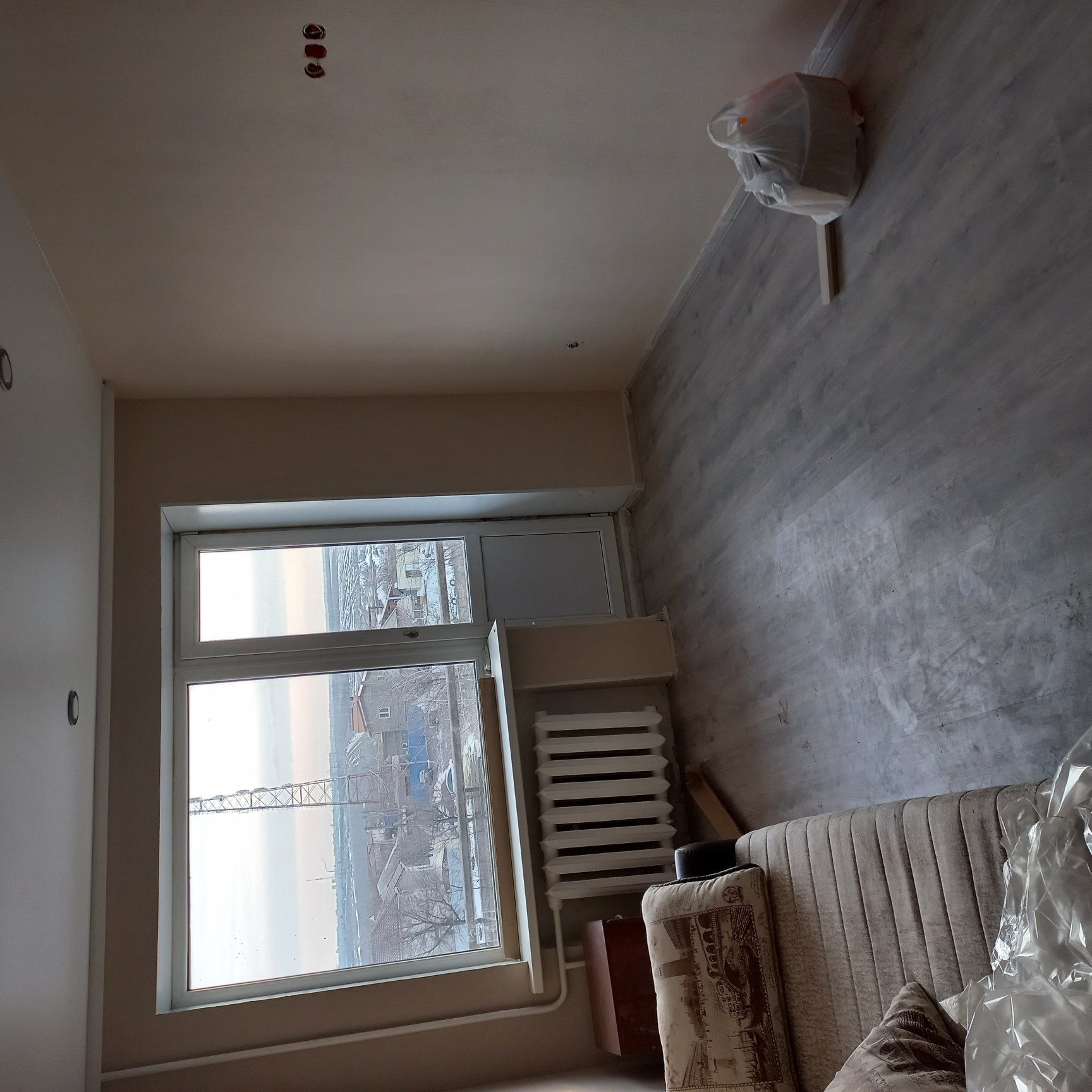 в комнате на полу ламинат натяжной потолок сплит система стены обои