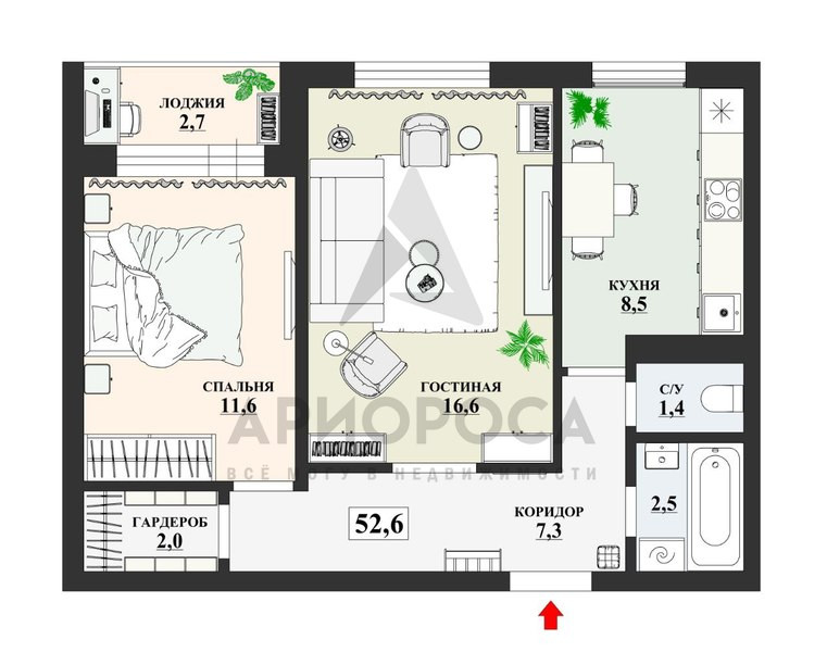 Общая площадь 52.6 м2